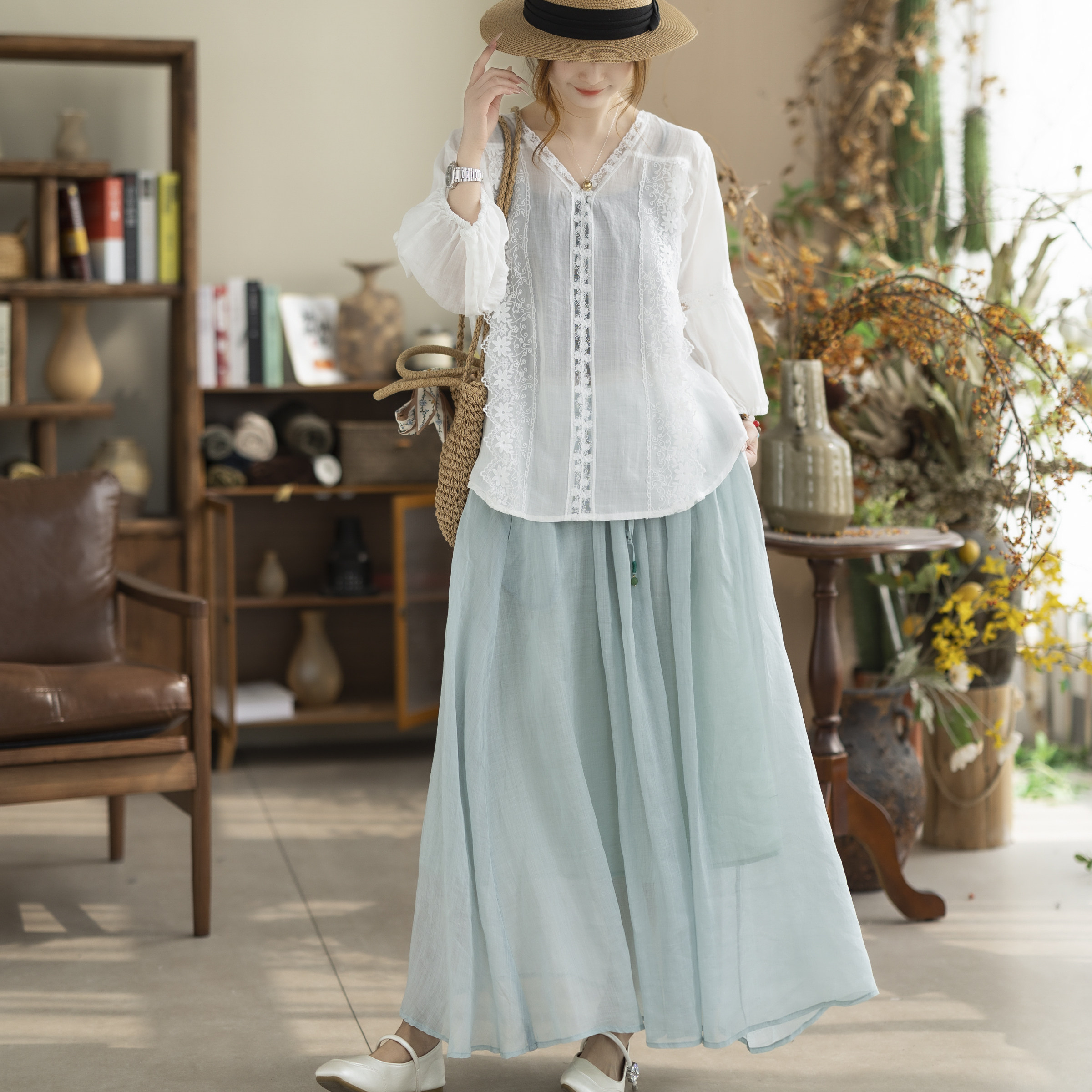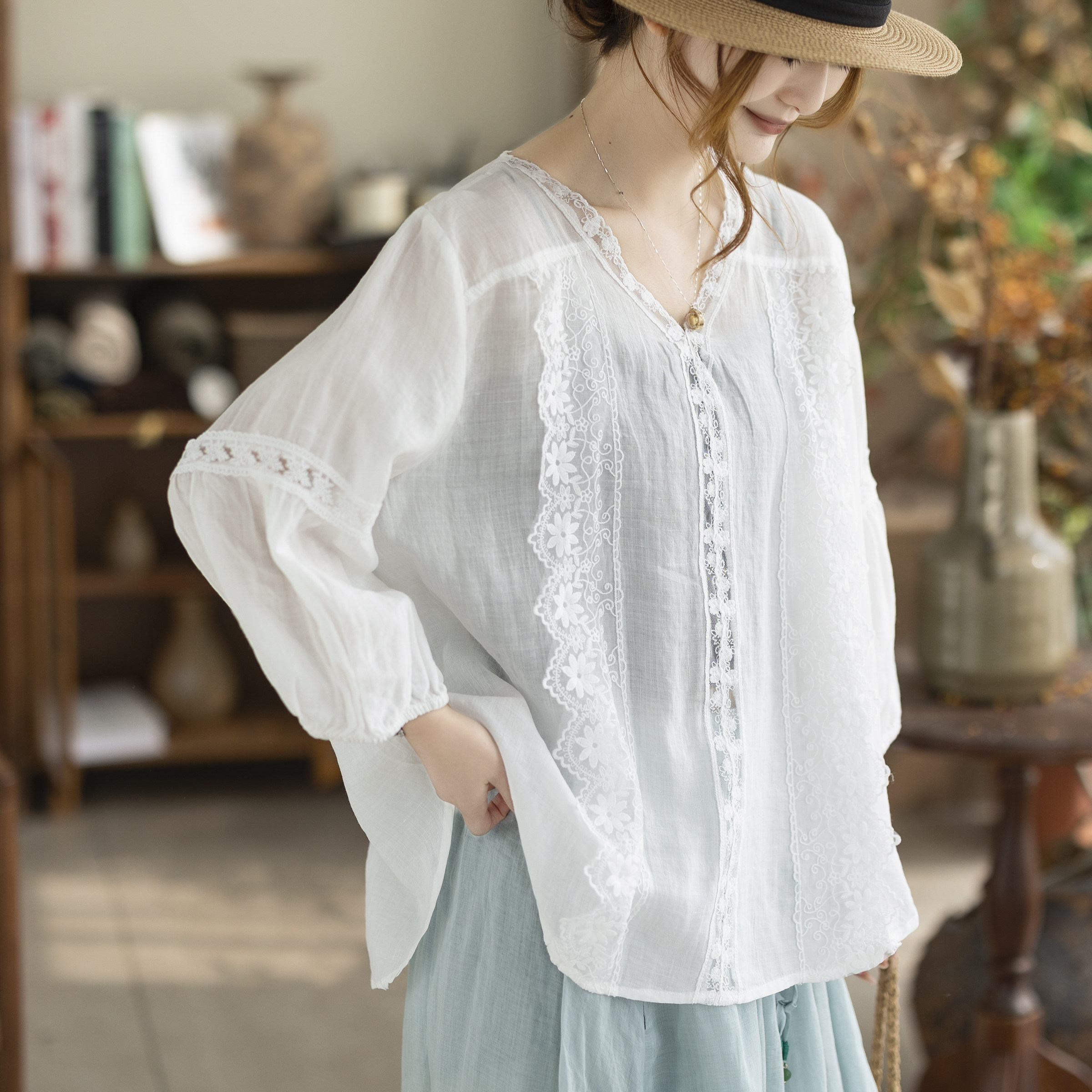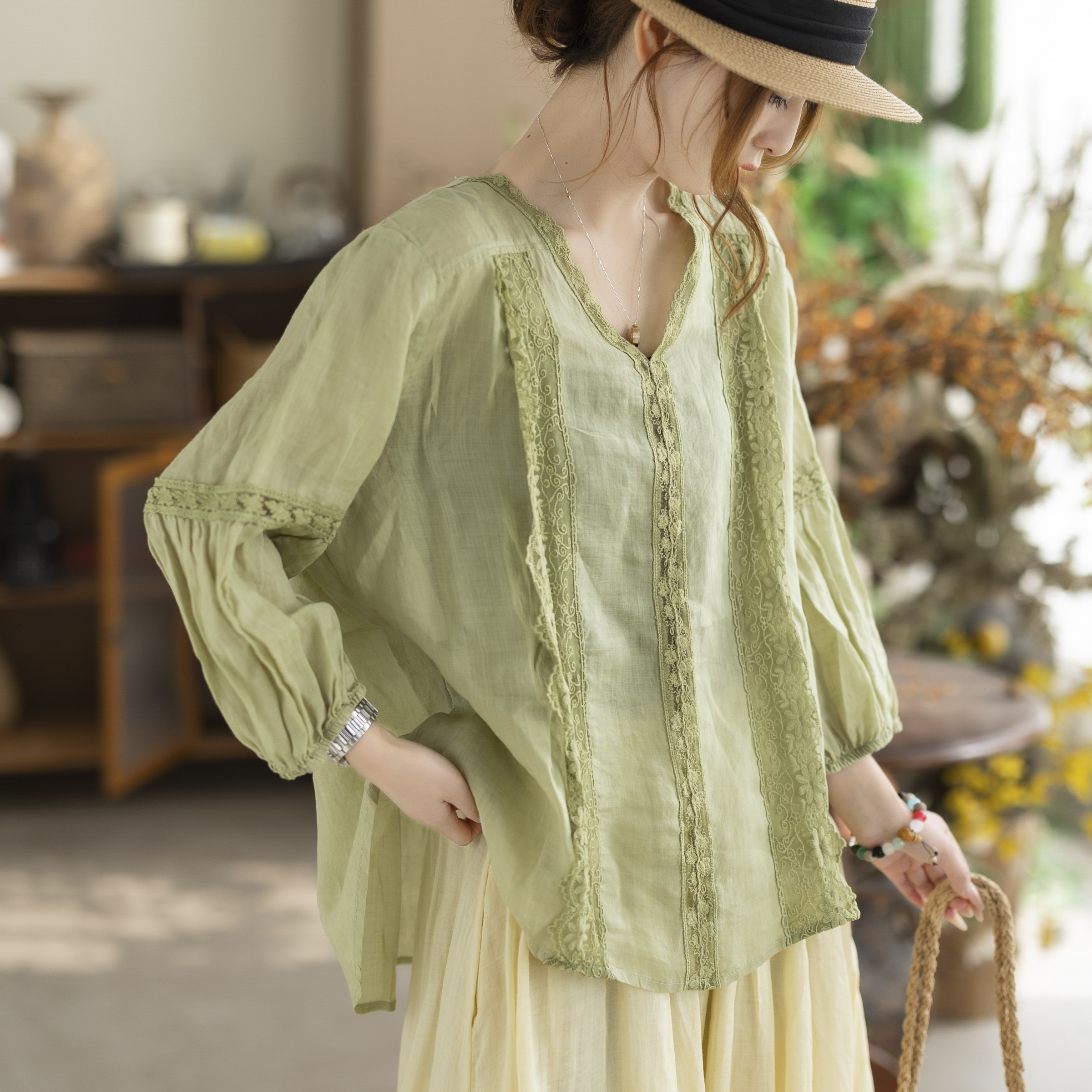 咖咪羽新款苎麻紫色衬衣女蕾丝V领灯笼袖宽松透气女装上衣小衫