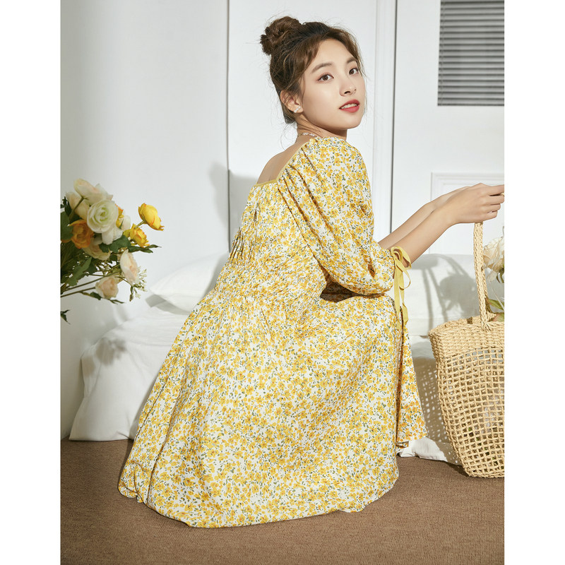 唐狮碎花连衣裙夏季女装方领泡泡袖收腰茶歇设计感裙子法式