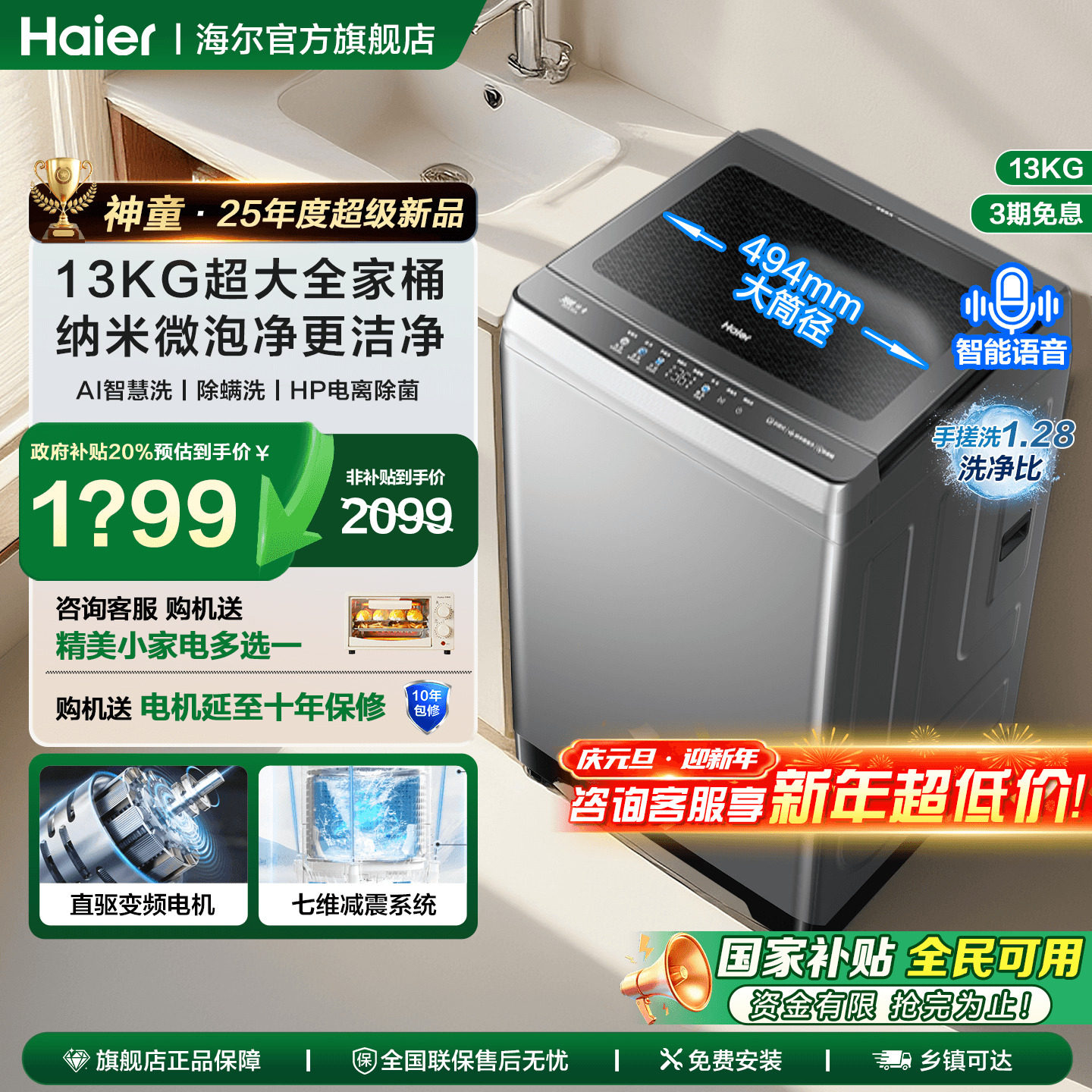 [政府补贴]海尔13公斤大容量波轮洗衣机12kg全自动家用57E旗舰店