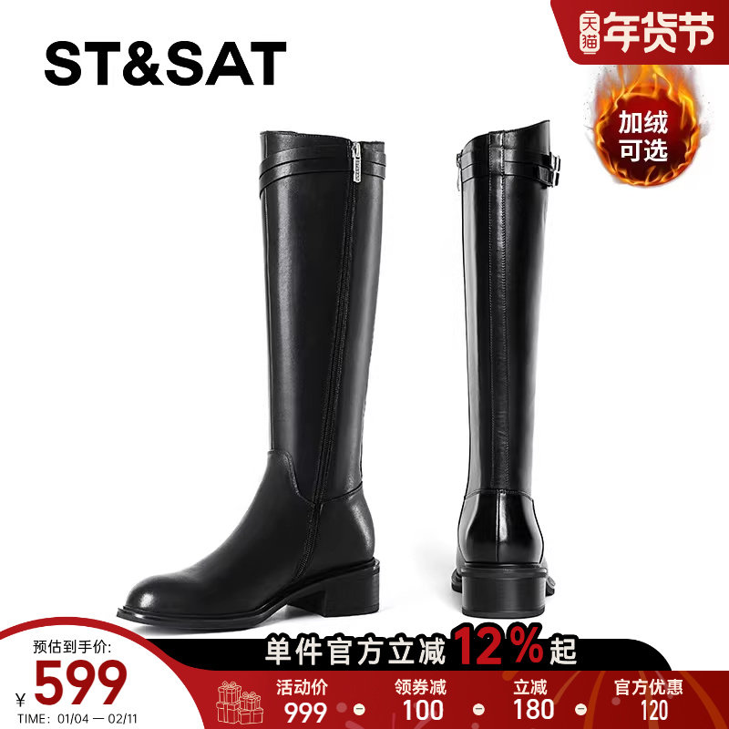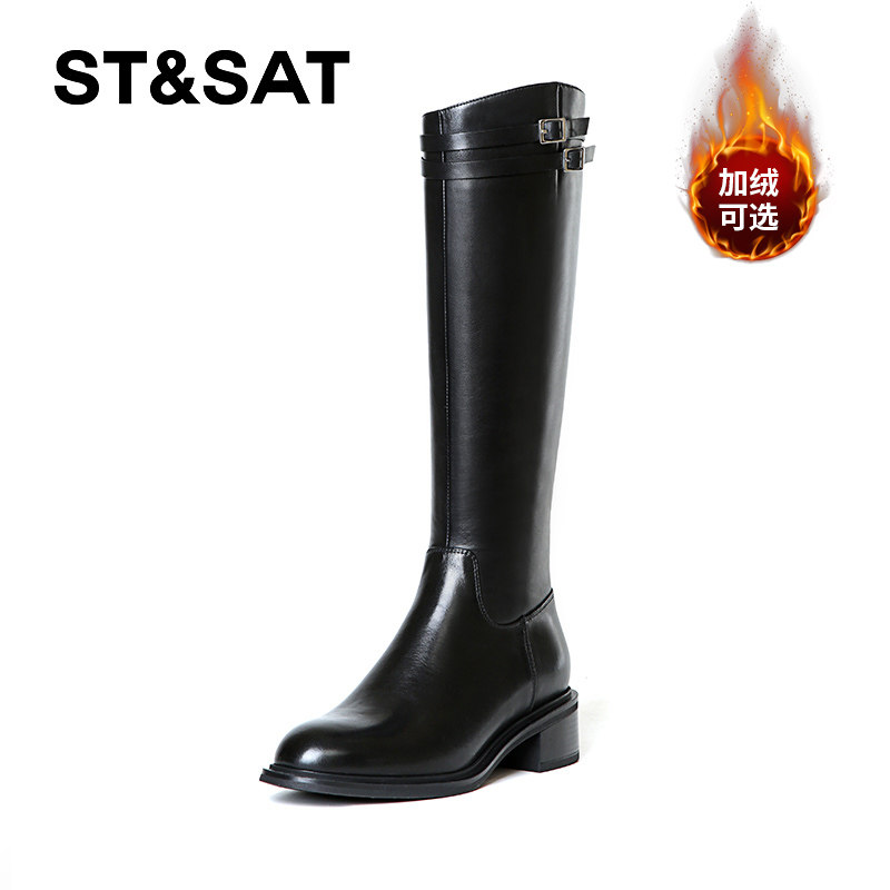 星期六加绒英伦长筒靴女2025秋冬粗跟圆头显瘦高不过膝全牛皮长靴