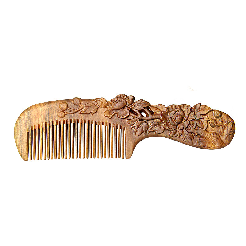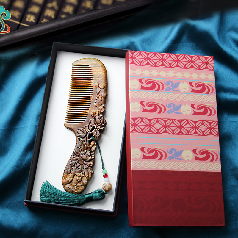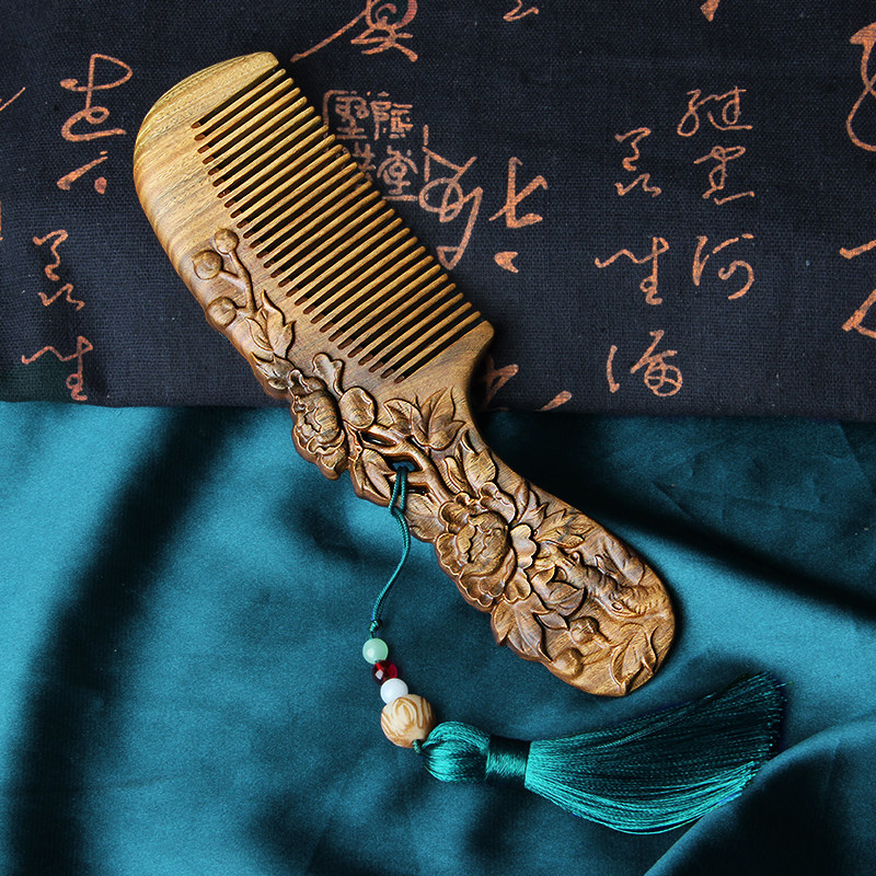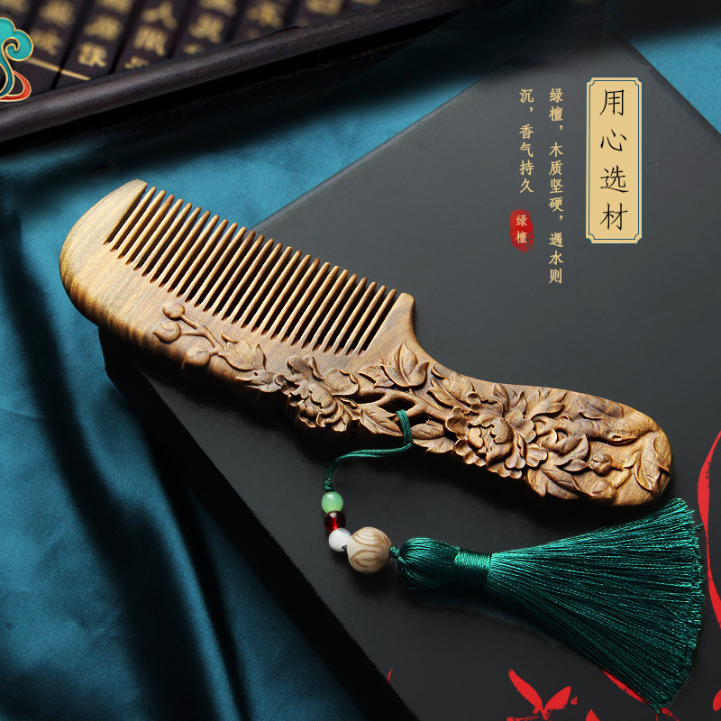 梳头绿檀木梳子国风镂空雕花雕刻古风送礼七夕情人按摩木梳经