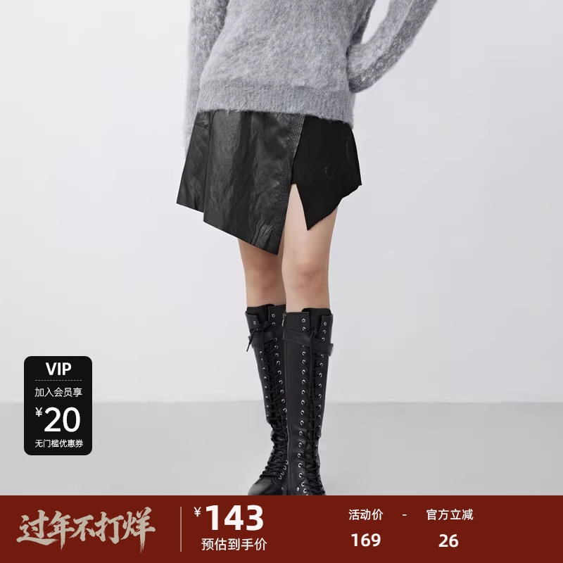 sdeer圣迪奥女装冬裙子个性拼接不规则毛呢A字黑色短裙S21481307
