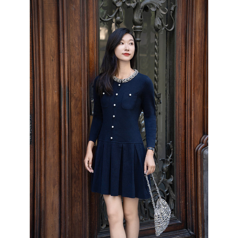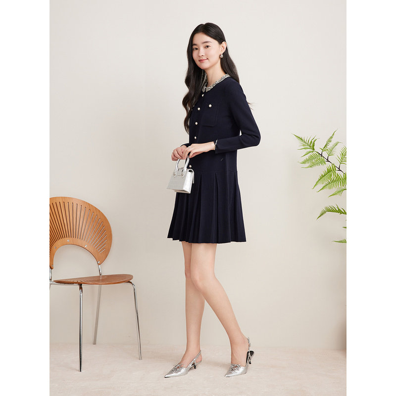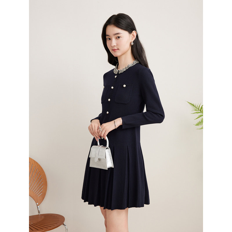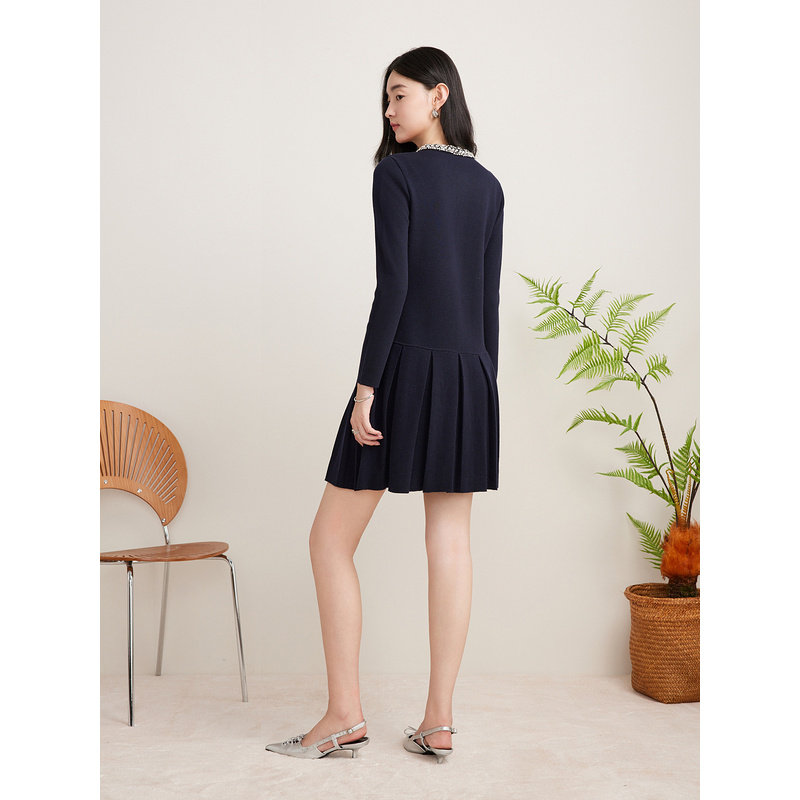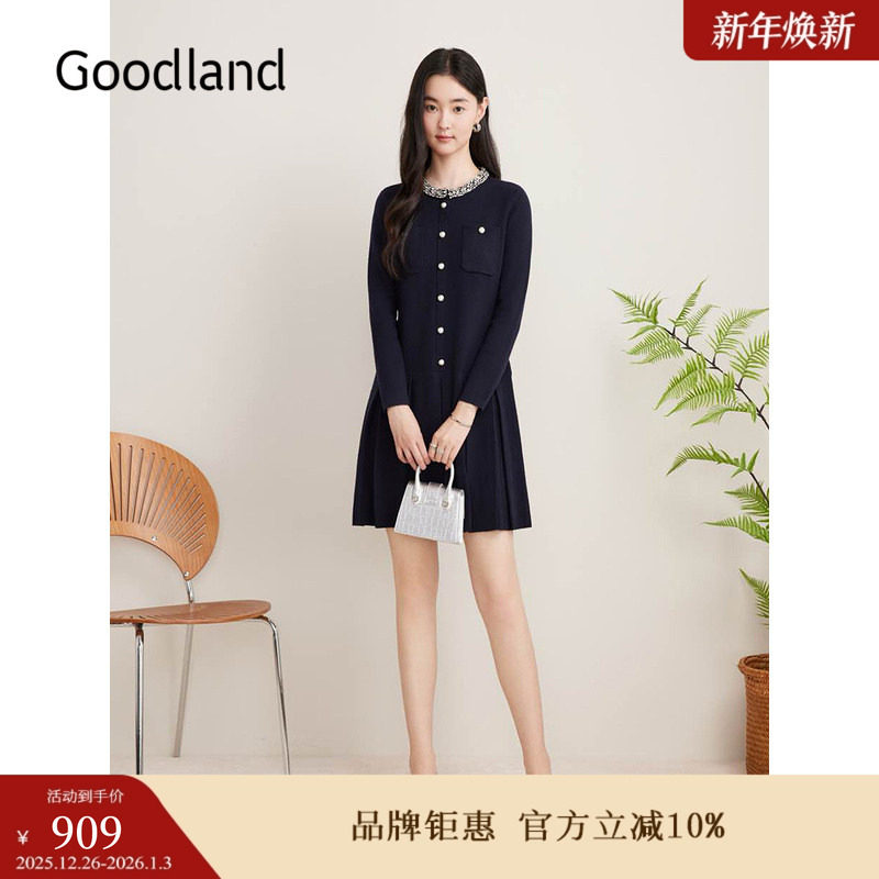 Goodland美地秋季法式小香风钉珠装饰拼接百褶针织连衣裙