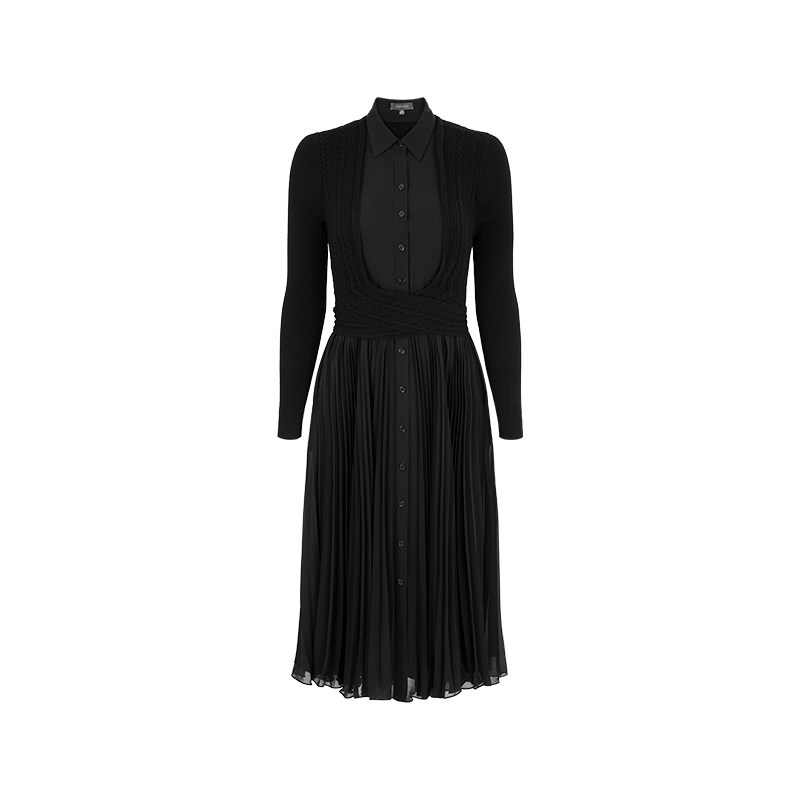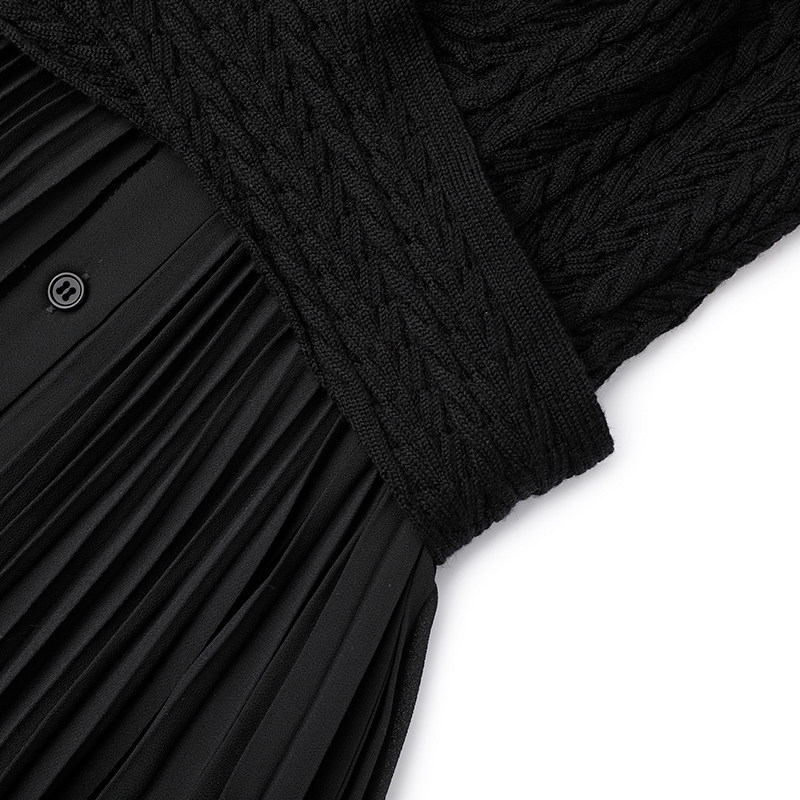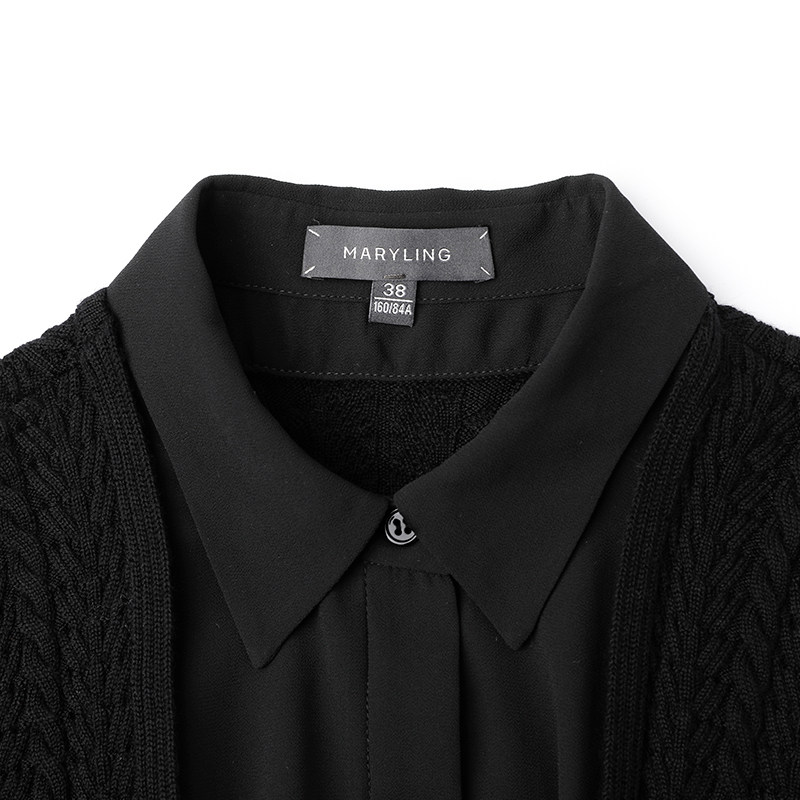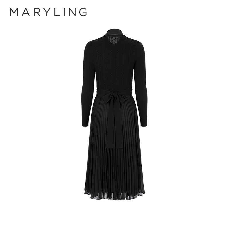 MARYLING玛俪琳秋季新品黑色衬衣式中长裙针梭拼接百褶连衣裙