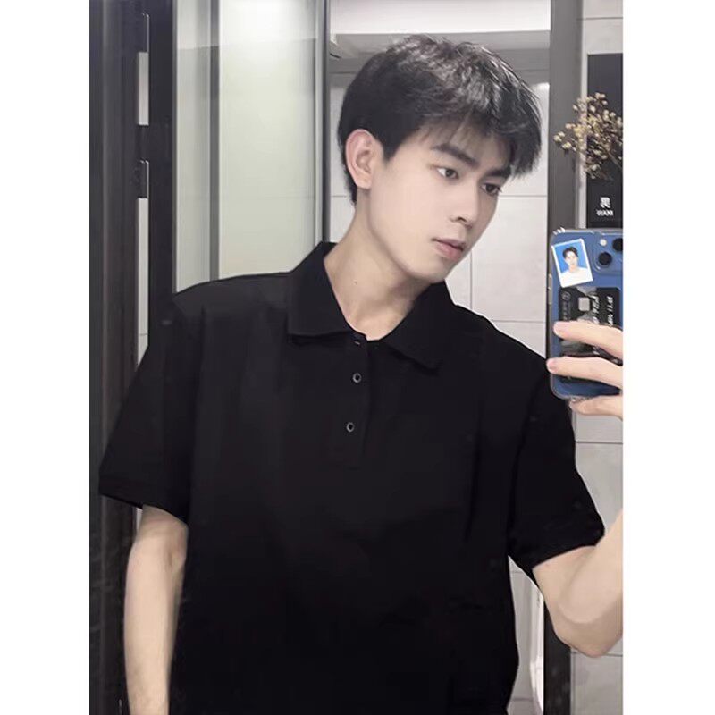 纯黑色短袖polo衫男式夏季高级感痞帅翻领t恤美式重磅正肩五分袖