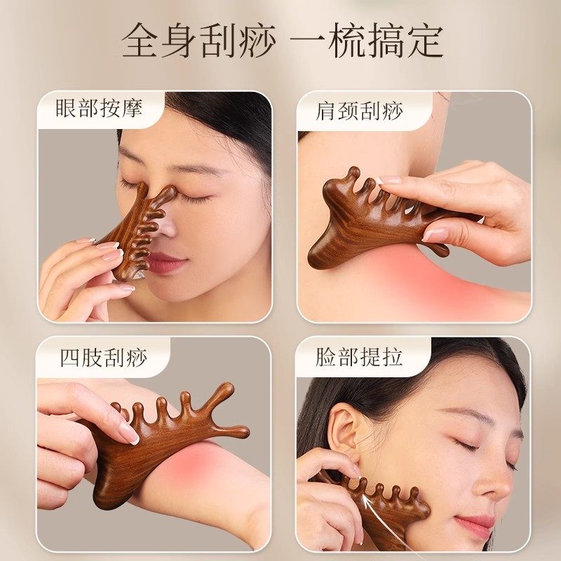 四合一多功能头皮檀木按摩梳子头部脱发头疗脸部刮痧疏通经络神器