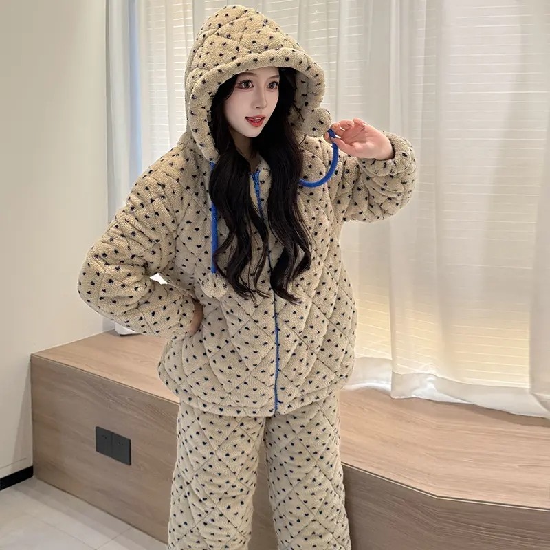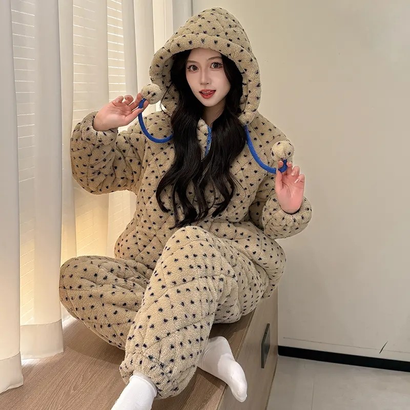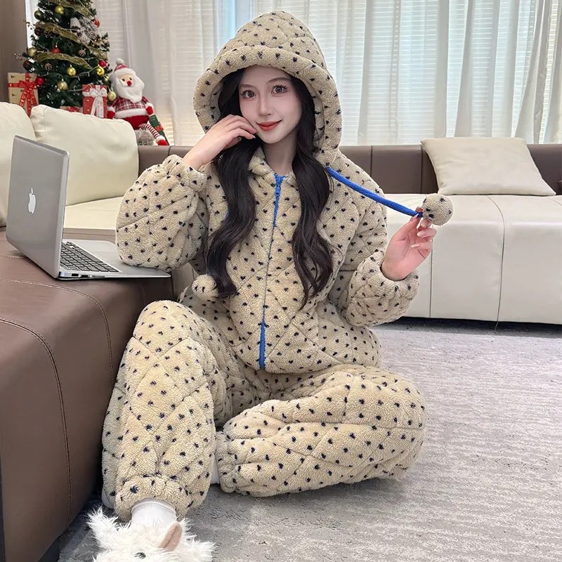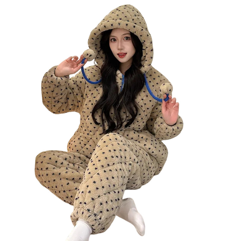 奶fufu冬季睡衣女款2025加厚珊瑚绒三层夹棉袄女生连帽家居服加绒