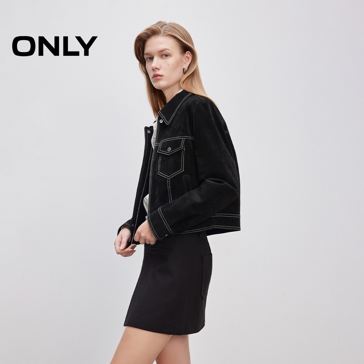 ONLY2025冬季新款挺阔真皮面料正肩翻领直筒短款开衫皮衣外套女