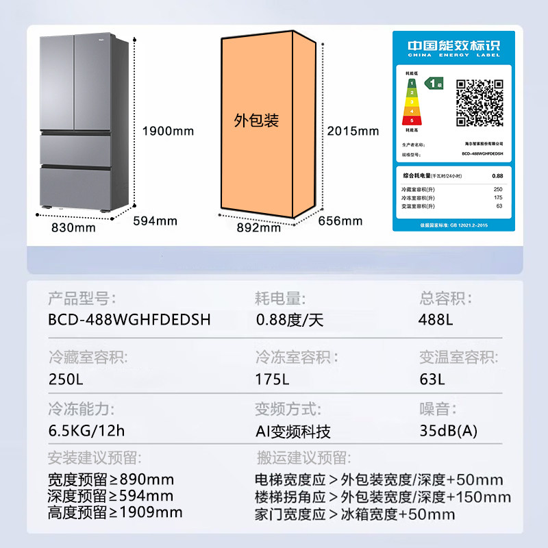 海尔小红花488L法式多门电冰箱家用大容量超薄594mm风冷无霜变频