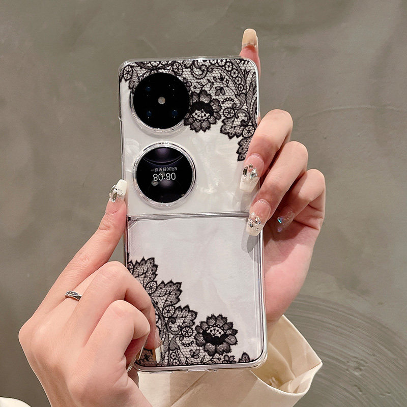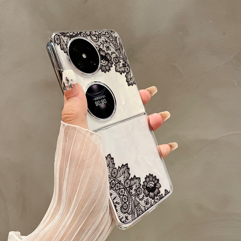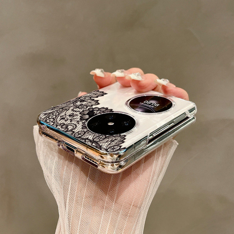 热瓜适用于华为P50pocket/Pocket2/pocketS手机壳折叠屏保护套新款气质高档UV透明壳全包防摔套黑色蕾丝花朵