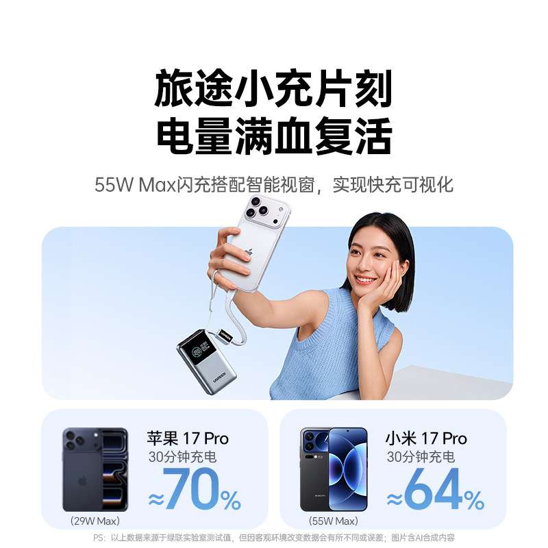 【充电宝3C认证可上飞机】绿联55W能量湃10000毫安2026新款充电宝便携适用苹果17小米移动电源正品官方旗舰店