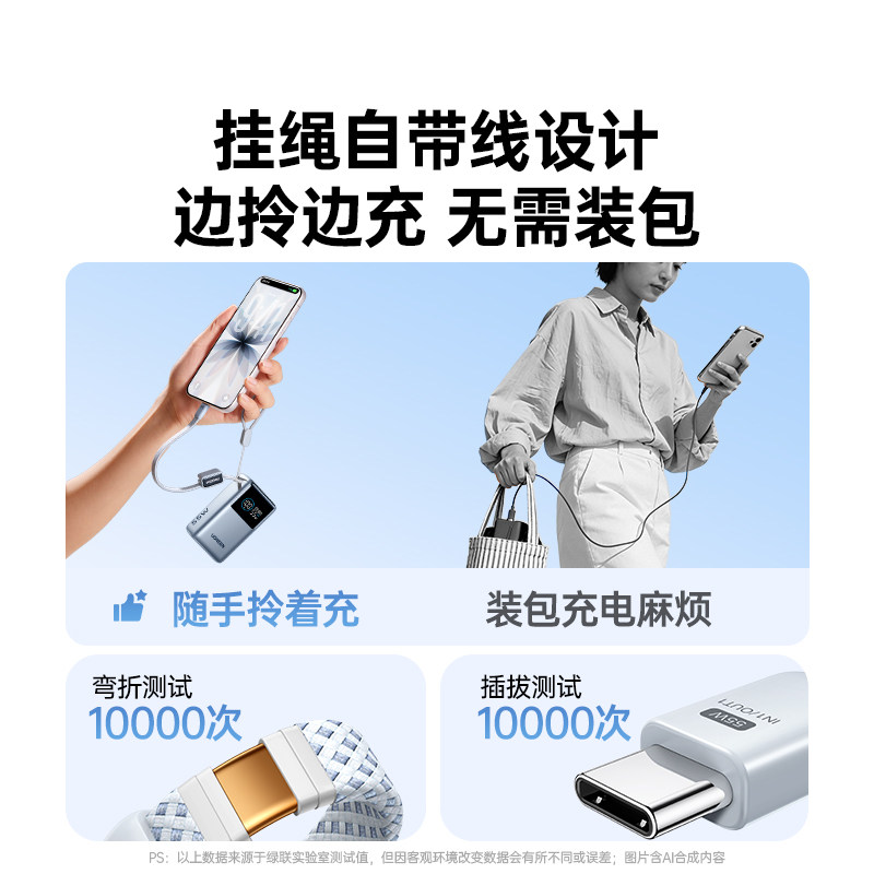 【3C认证可上飞机】脑洞范充电宝自带伸缩线2026新款10000毫安大容量便携式卷尺移动电源适用苹果17华为16pm