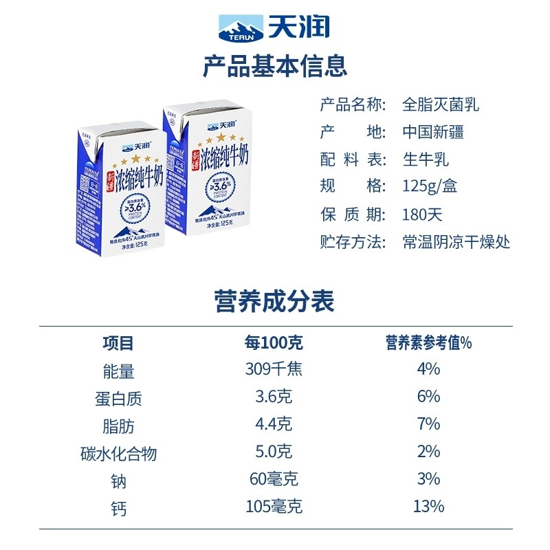 新疆天润浓缩纯牛奶125g×20盒装天山牧场官方旗舰店早餐纯奶整箱