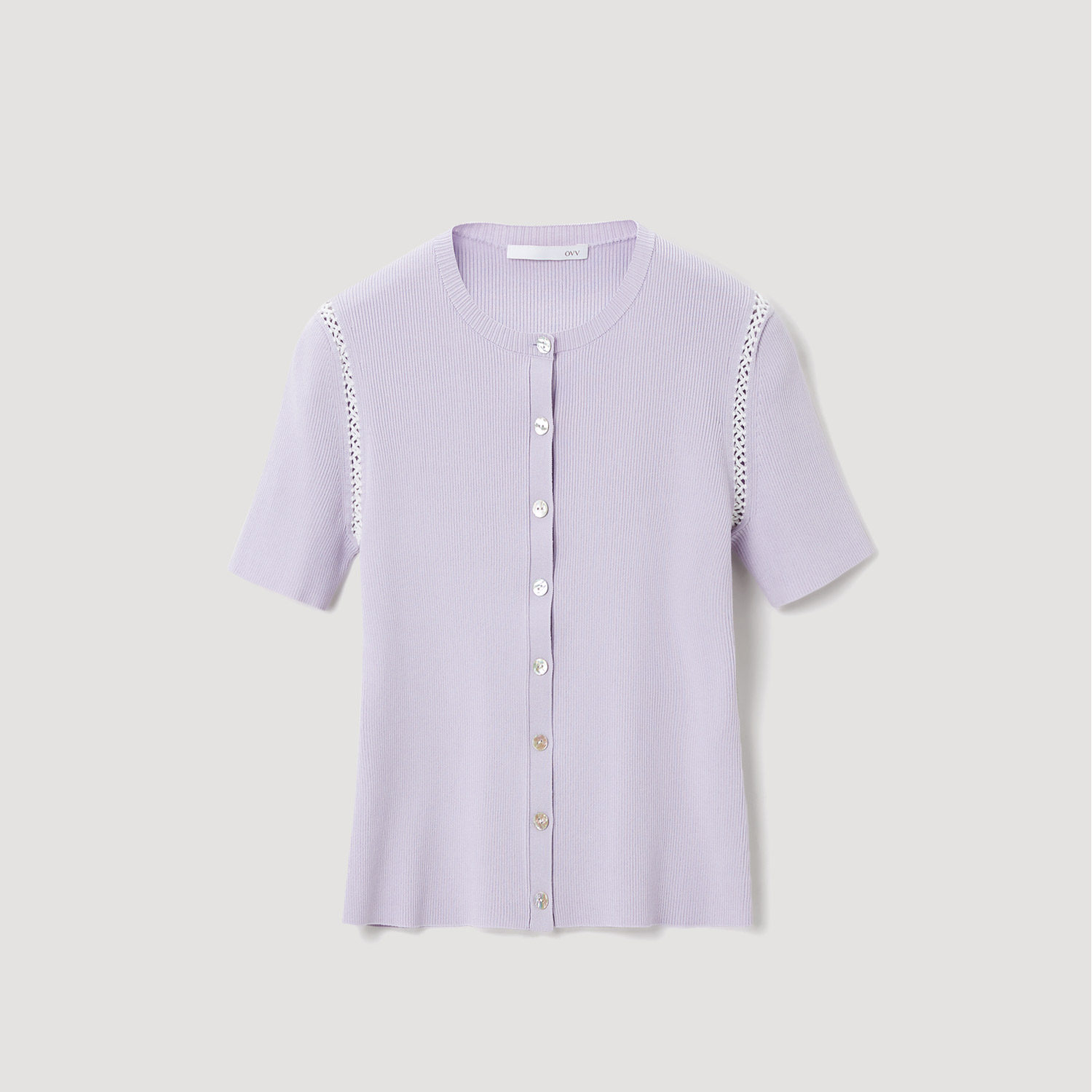OVV春夏热卖女装醋酸棉质混纺基础圆领镂空织带短袖针织衫