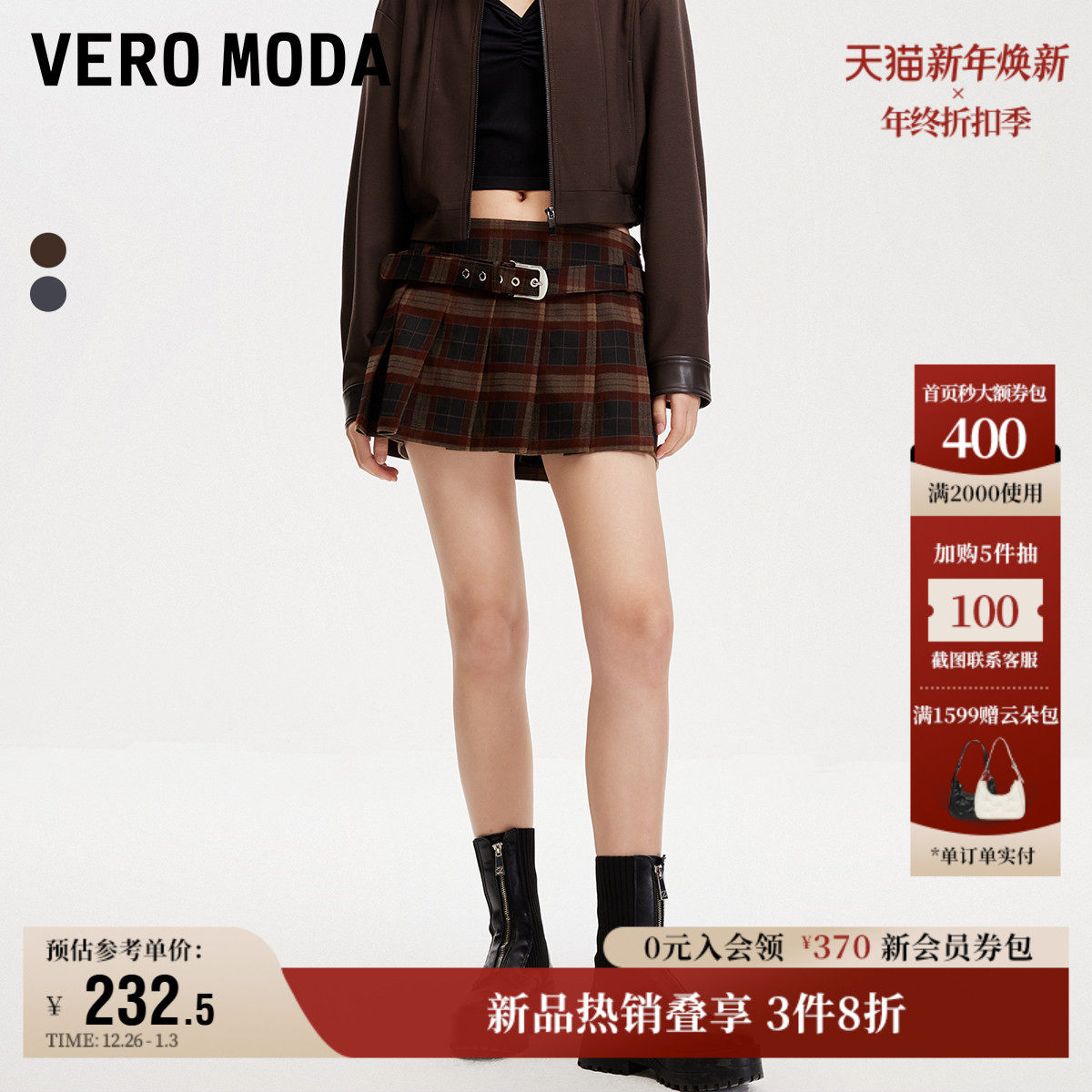 Vero Moda奥莱半身裙2025秋季新款商场同款低腰迷你裙格纹腰带