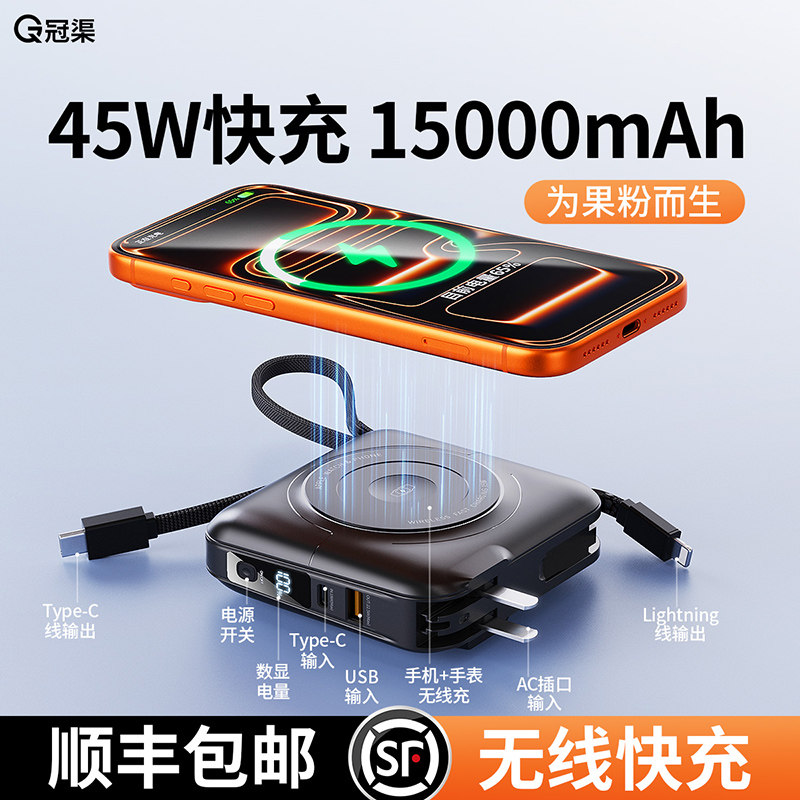 充电宝2026新款自带线AC插头45W快充适用苹果16磁吸apple watch手表充电器便携15000毫安magsafe无线充电器