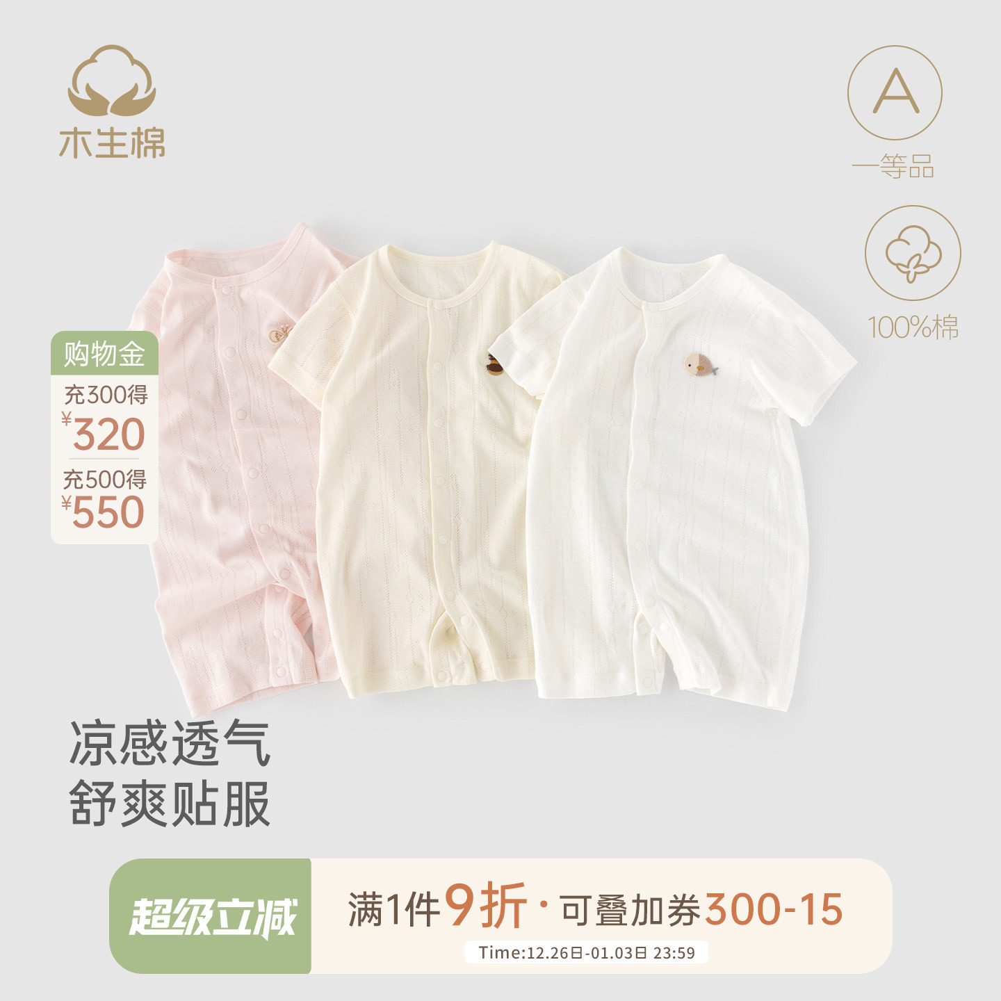 木生棉 宝宝夏季薄款连体睡衣新生婴儿短袖家居服纯棉可爱哈衣