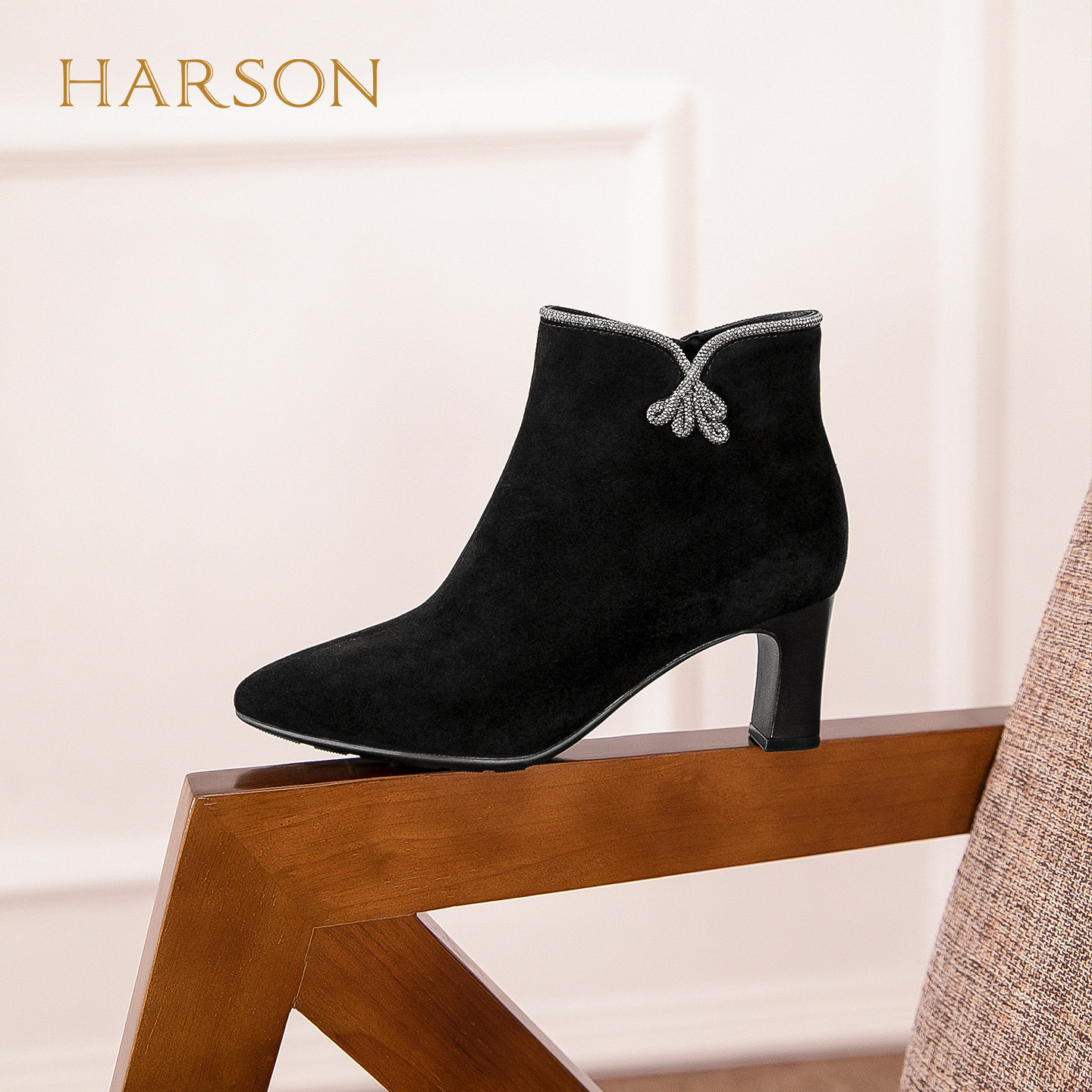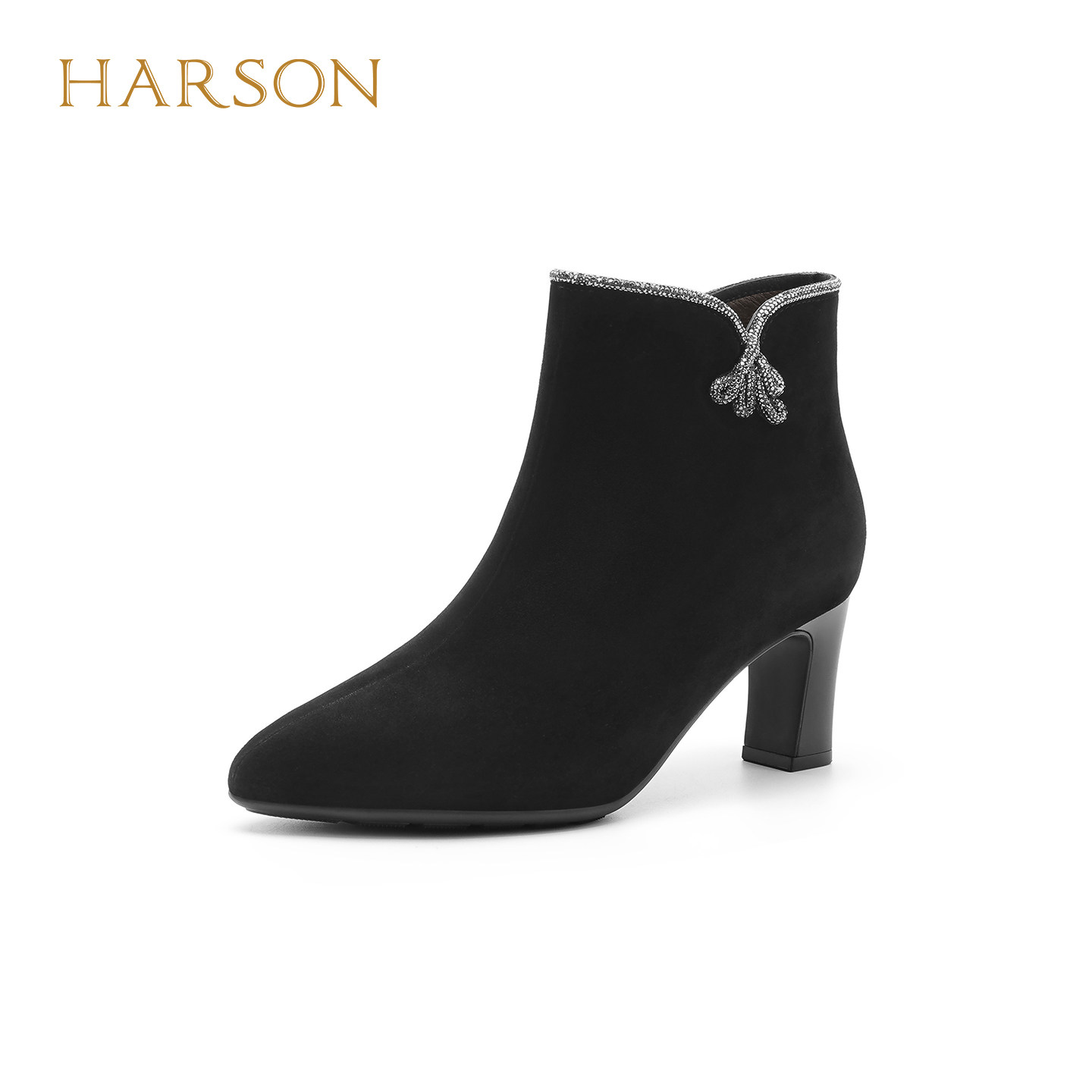 哈森尖头水钻绒面粗高跟时装靴气质显高女短靴2025冬新款HA257909