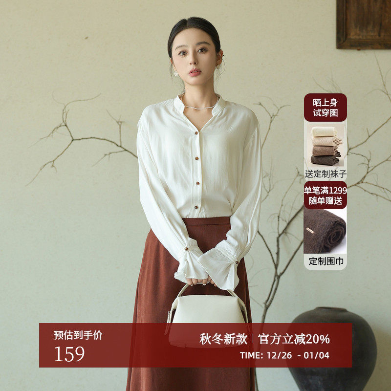 黑标BAIZHUO秋季新款新中式小V领简约慵懒风灯笼袖衬衫AZ43CS196