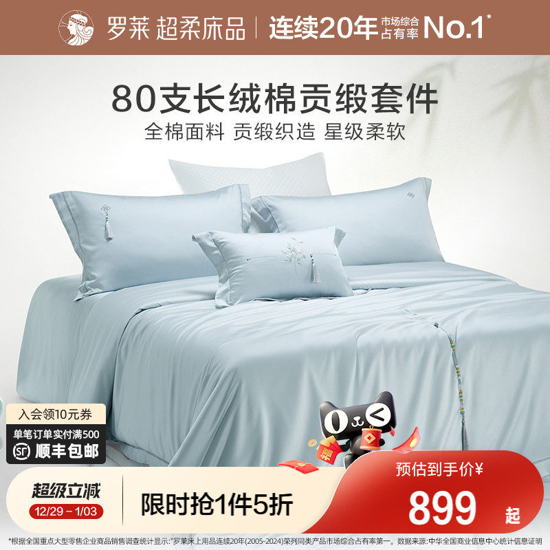 罗莱家纺纯棉套件25新品80支全棉贡缎1.8米双人床单被套四件套