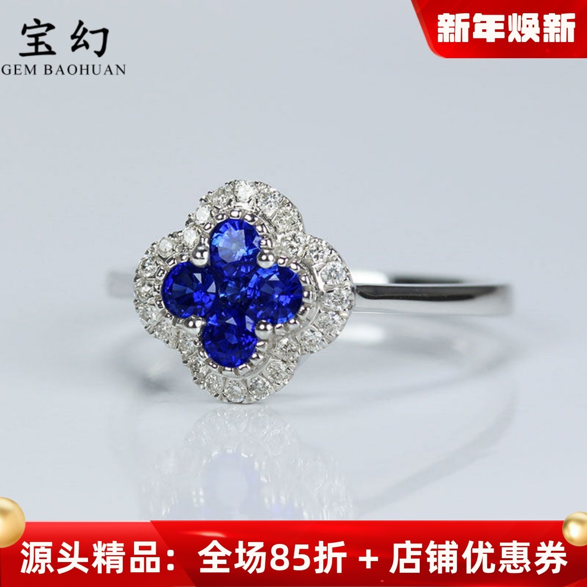 加大18K白金天然皇家蓝宝石幸运四叶草戒指 伴钻石女款指环套装