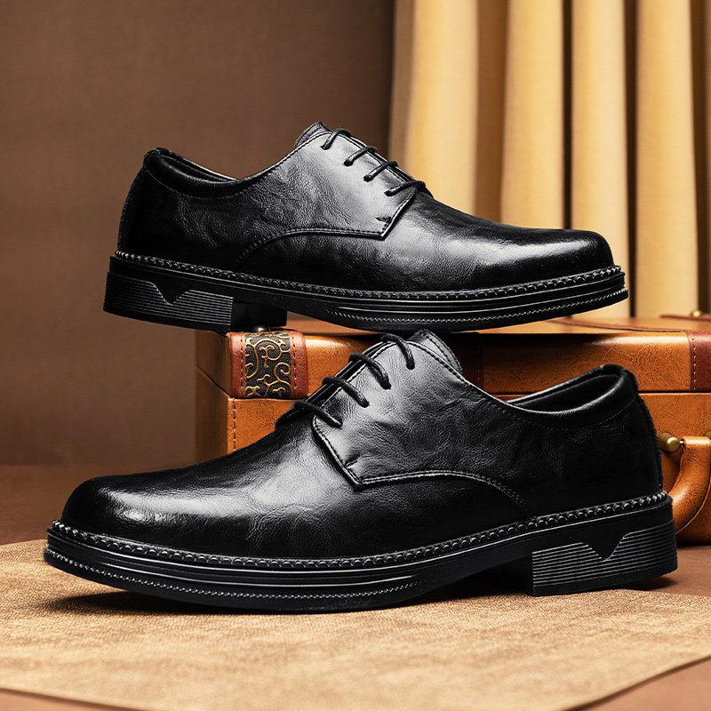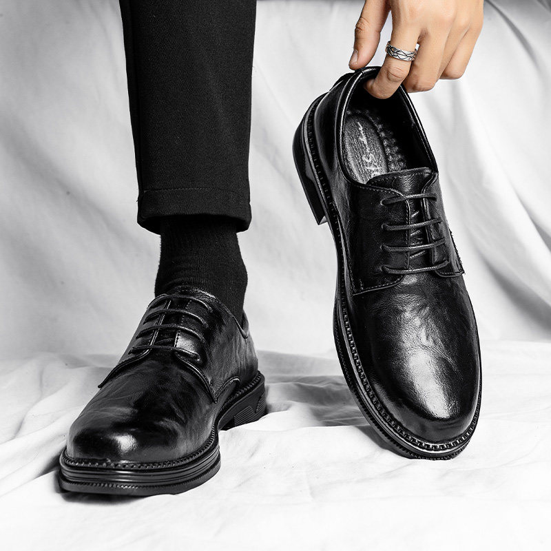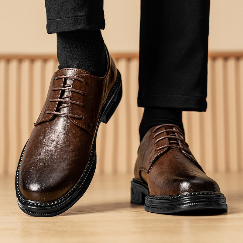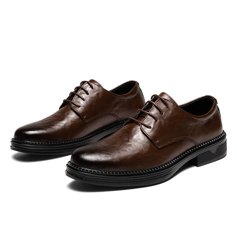 免开胶真皮休闲皮鞋男款软皮厚底增高透气商务系带平底缝线德比鞋