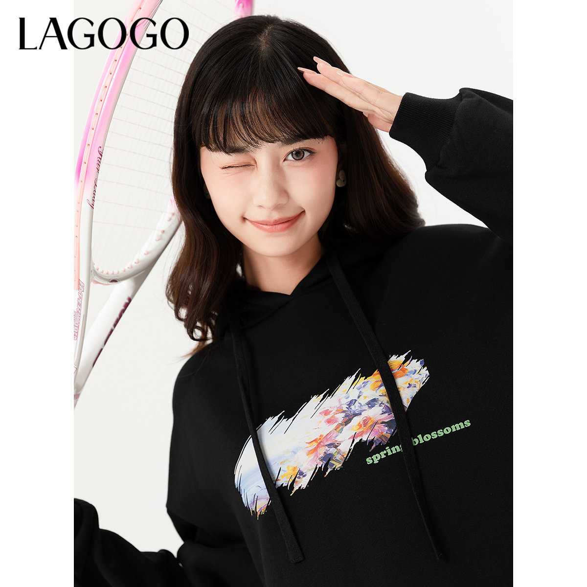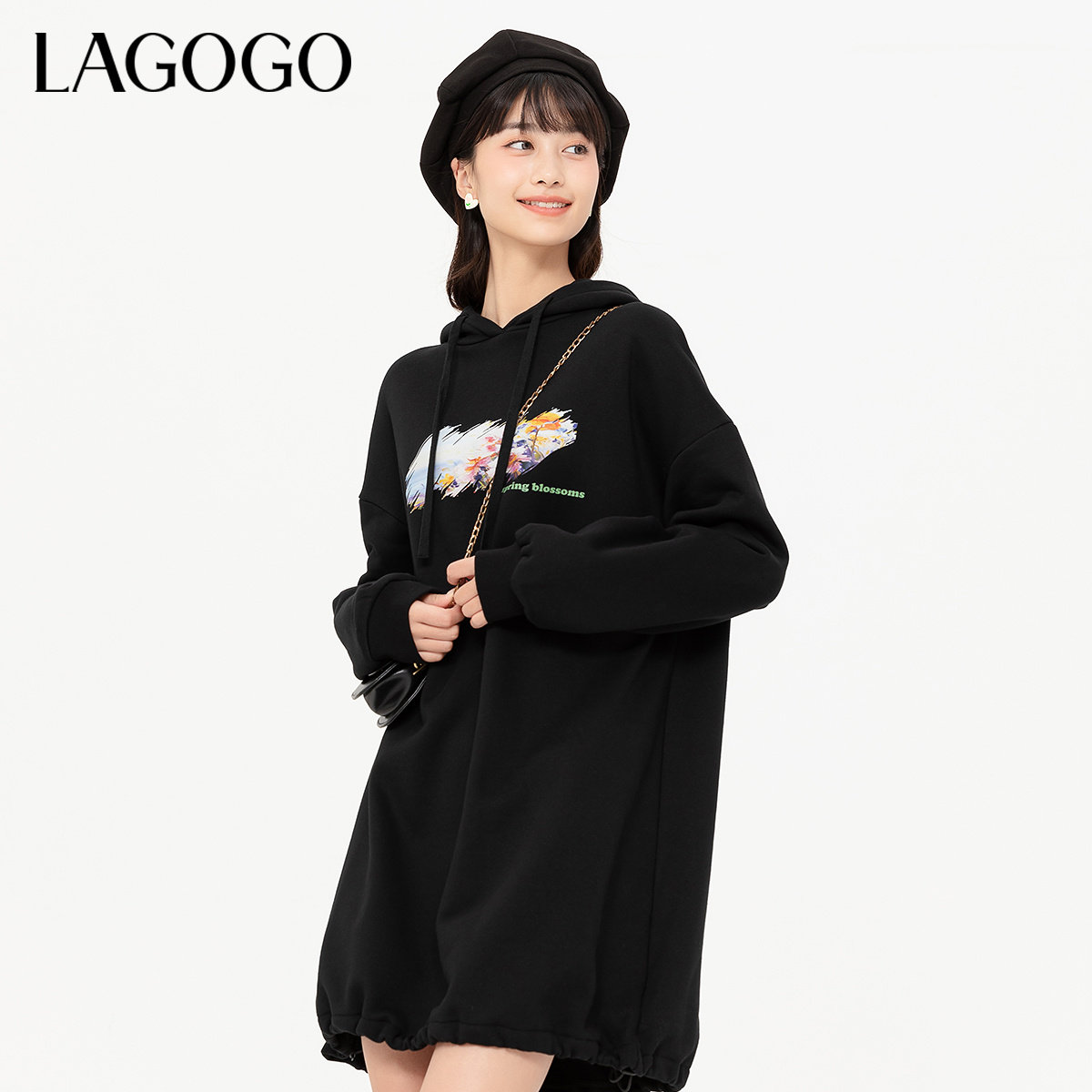 LAGOGO休闲连帽印花连衣裙女拉谷谷春季新款宽松黑色简约A字裙