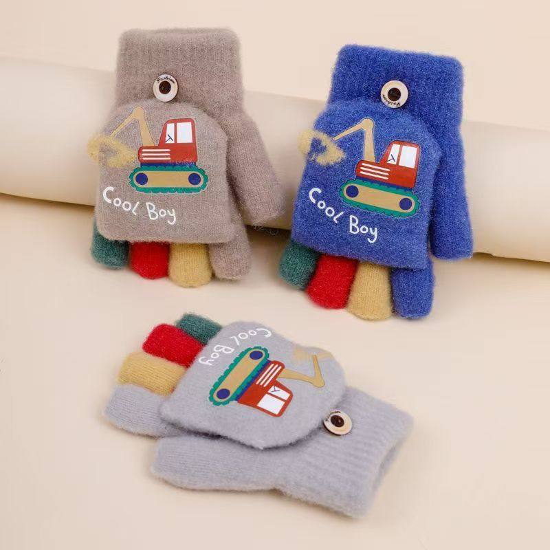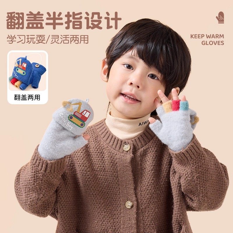 儿童保暖加绒男孩可爱挖机冬季卡通手套小童幼儿半指翻盖男童手套