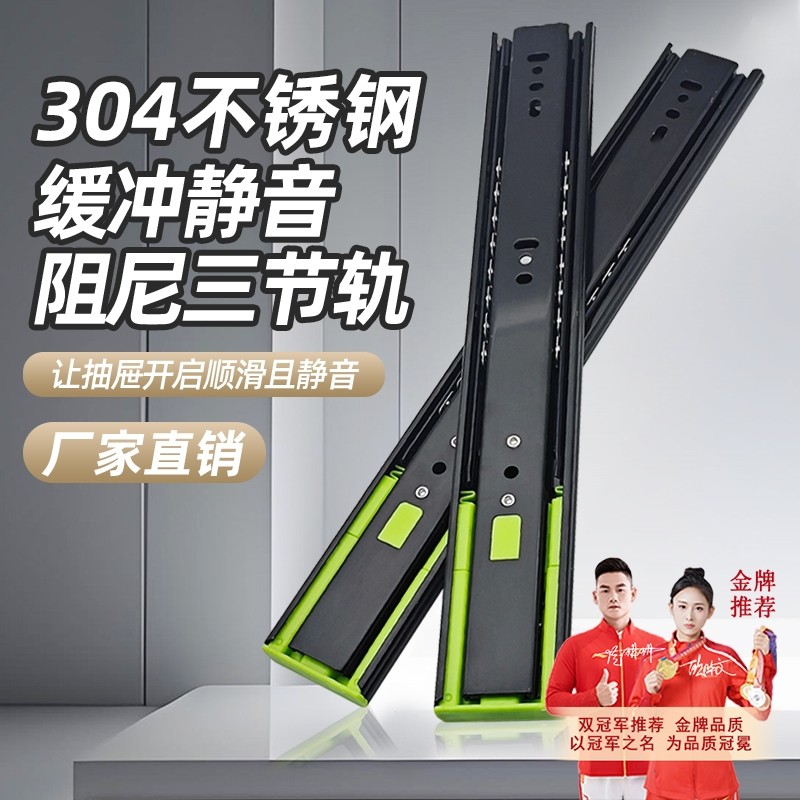 304不锈钢抽屉轨道三节轨滑道加厚阻尼缓冲静音橱柜滑轨反弹导轨
