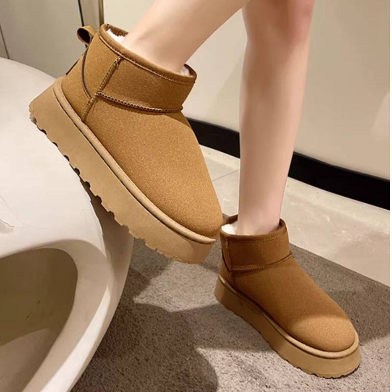 miu家厚底雪地靴女冬季真皮短靴羊毛侧拉链增高厚底加绒毛毛棉鞋