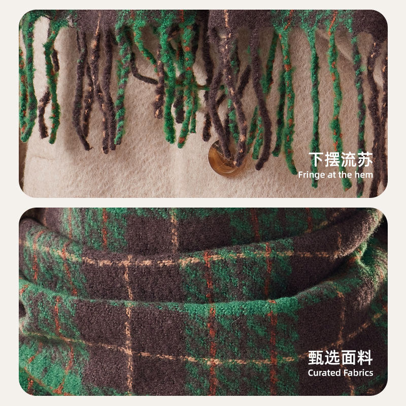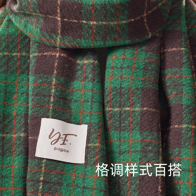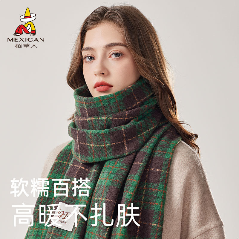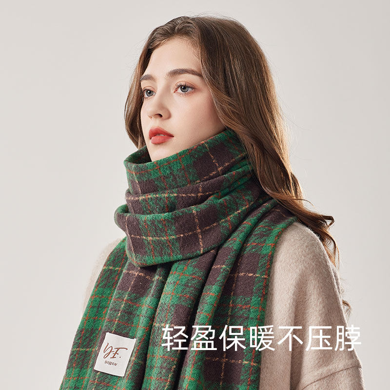 稻草人围巾绿色复古格子保暖围巾女秋冬气质时尚洋气围脖披肩两用