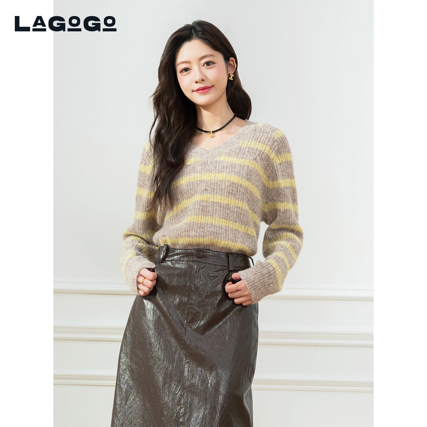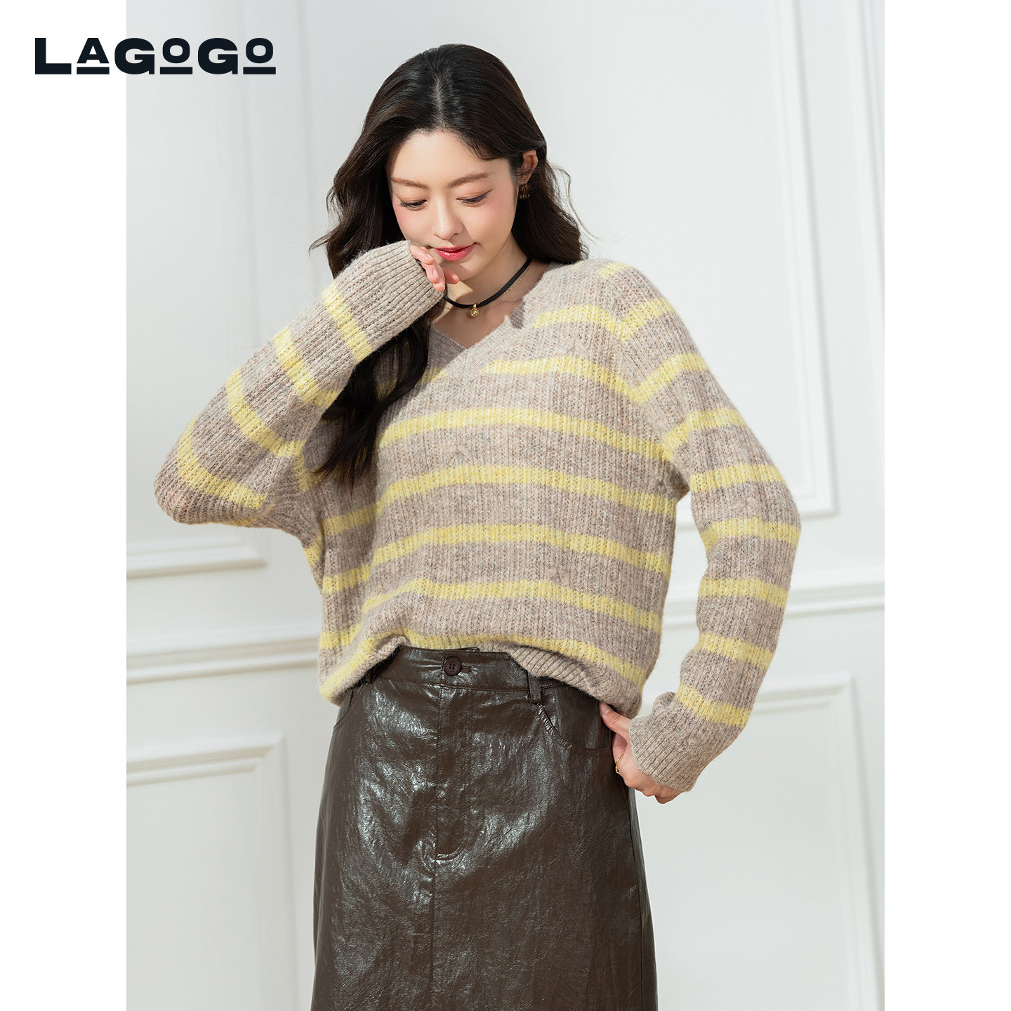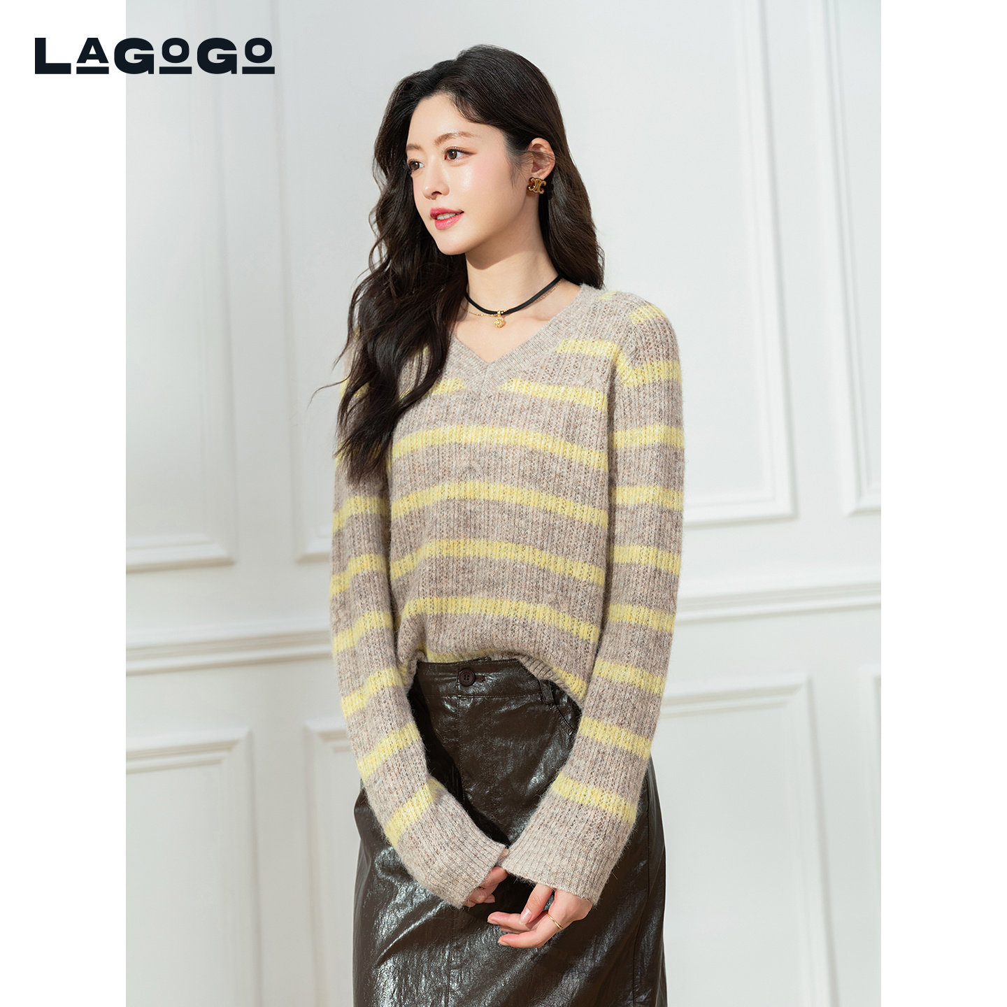 LAGOGO含羊毛V领条纹针织衫女拉谷谷2025冬季新款毛衣OCMM42XA12