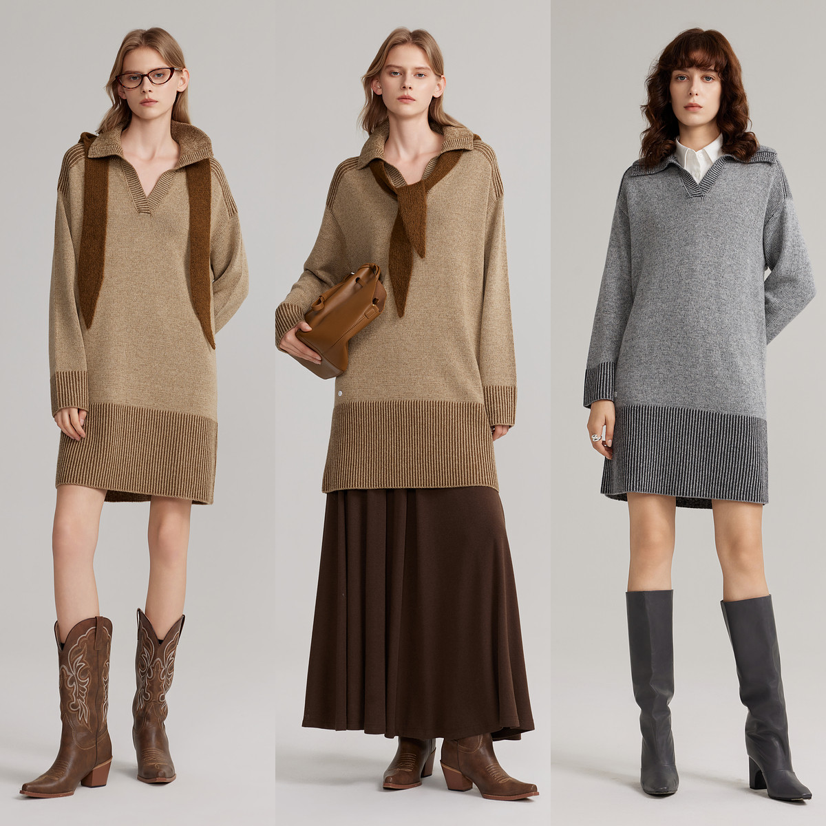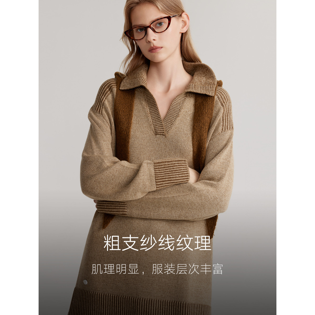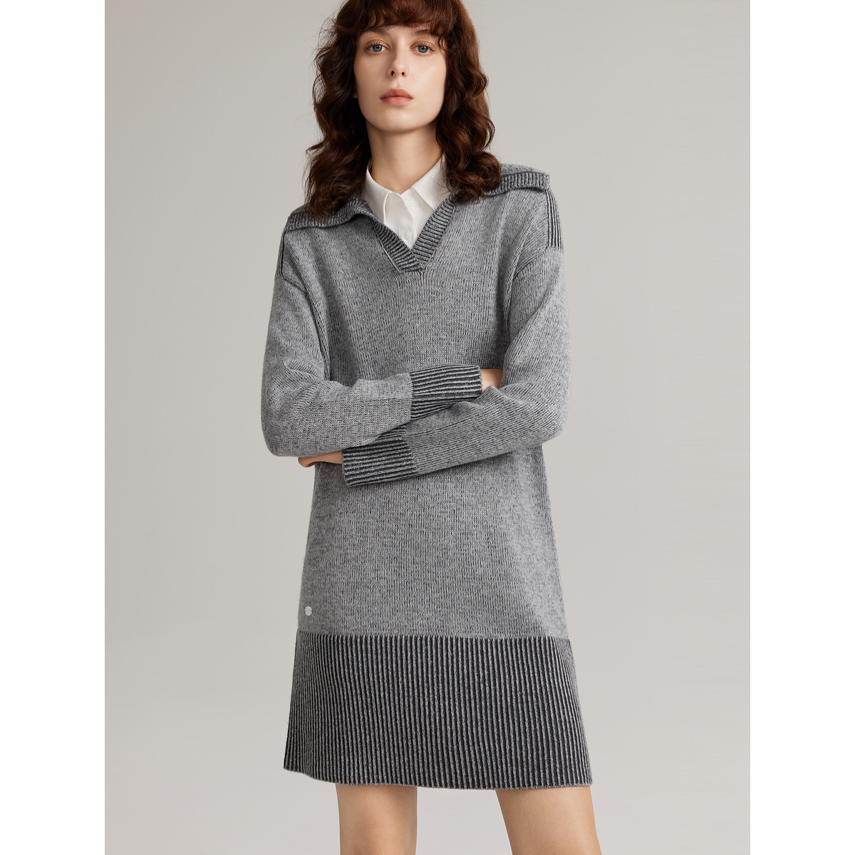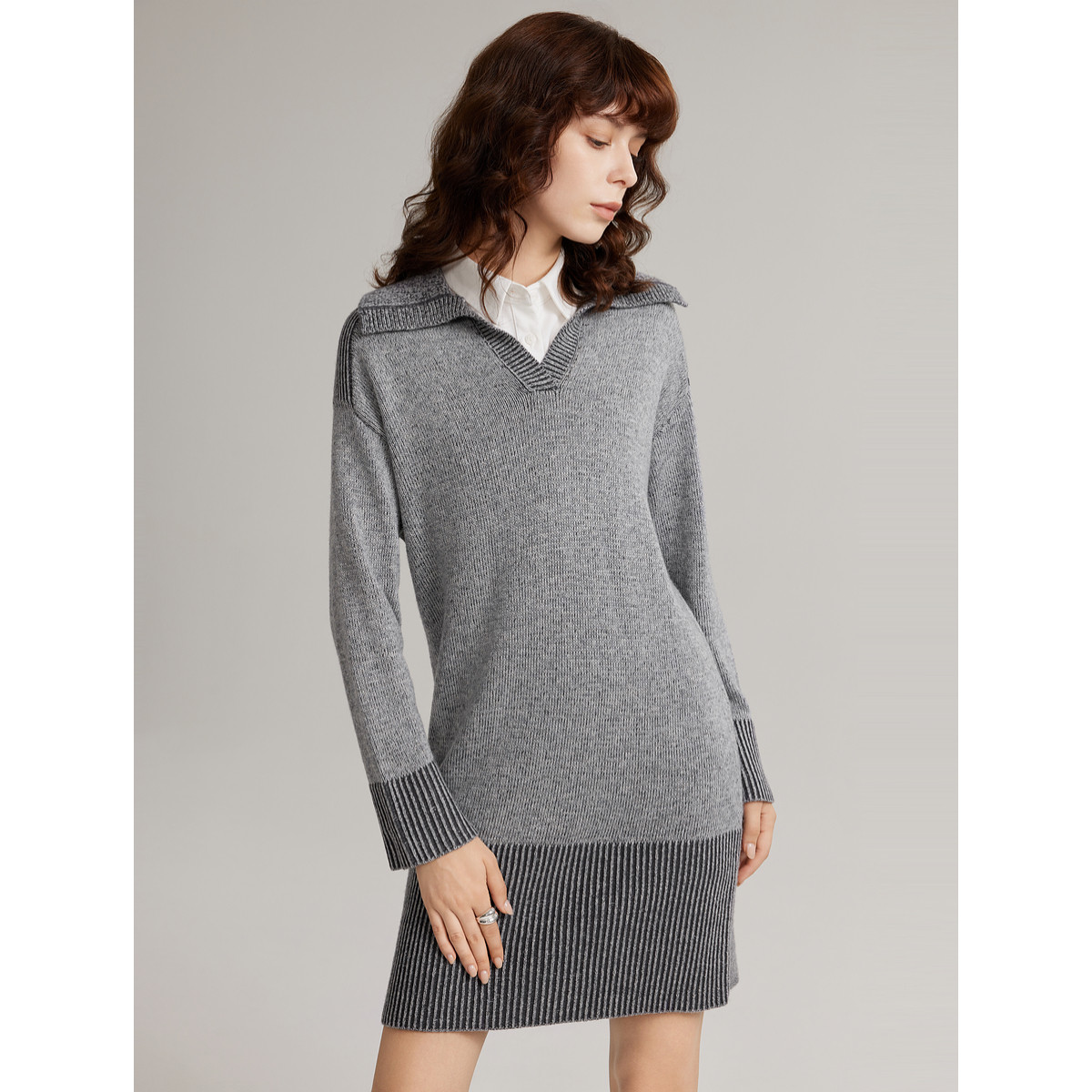 ELLE双色拼接纱线长袖针织连衣裙女2025冬季新款垂坠感休闲裙子