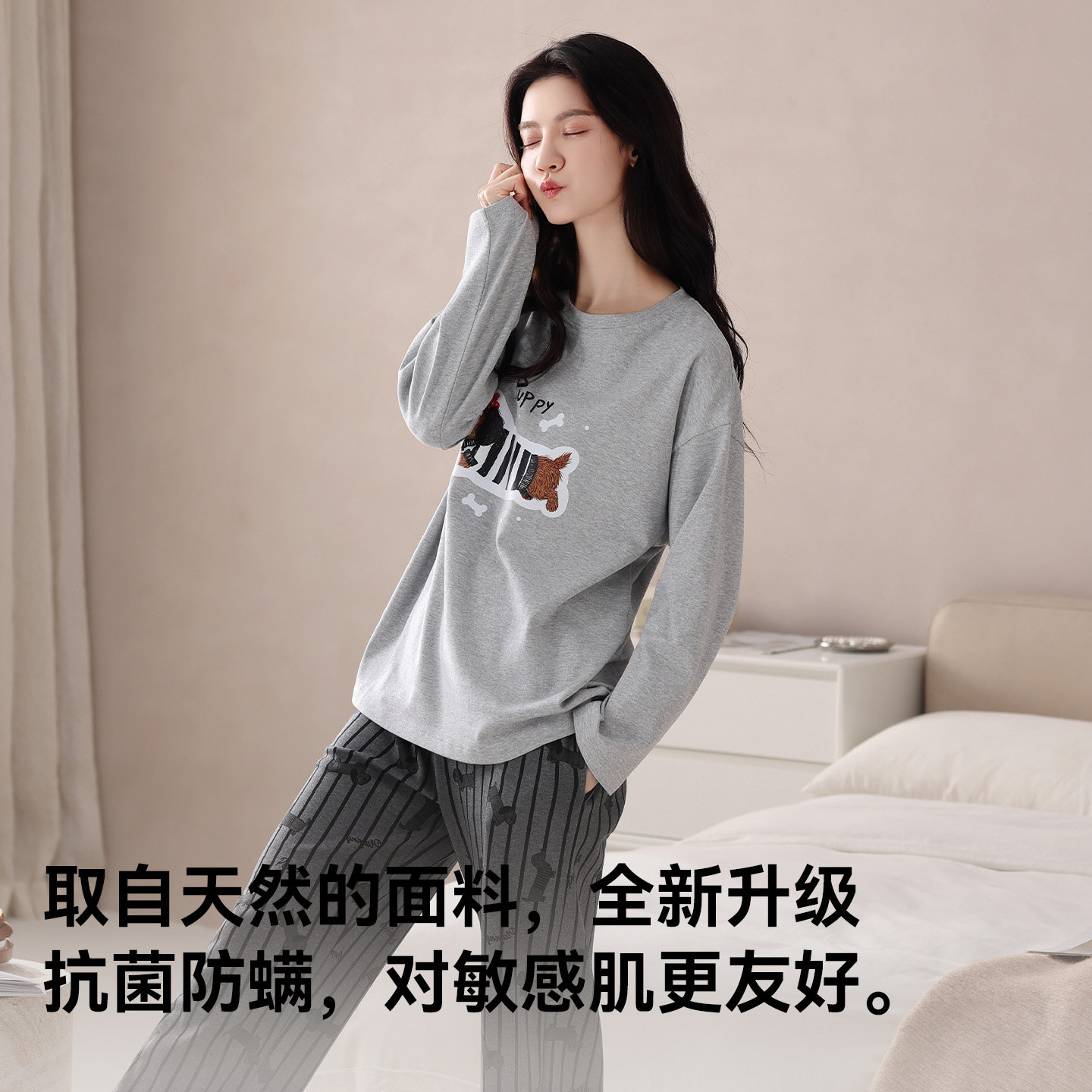 猫人新款圆领睡衣女带胸垫春秋季长袖卡通小狗家居服套装可外穿