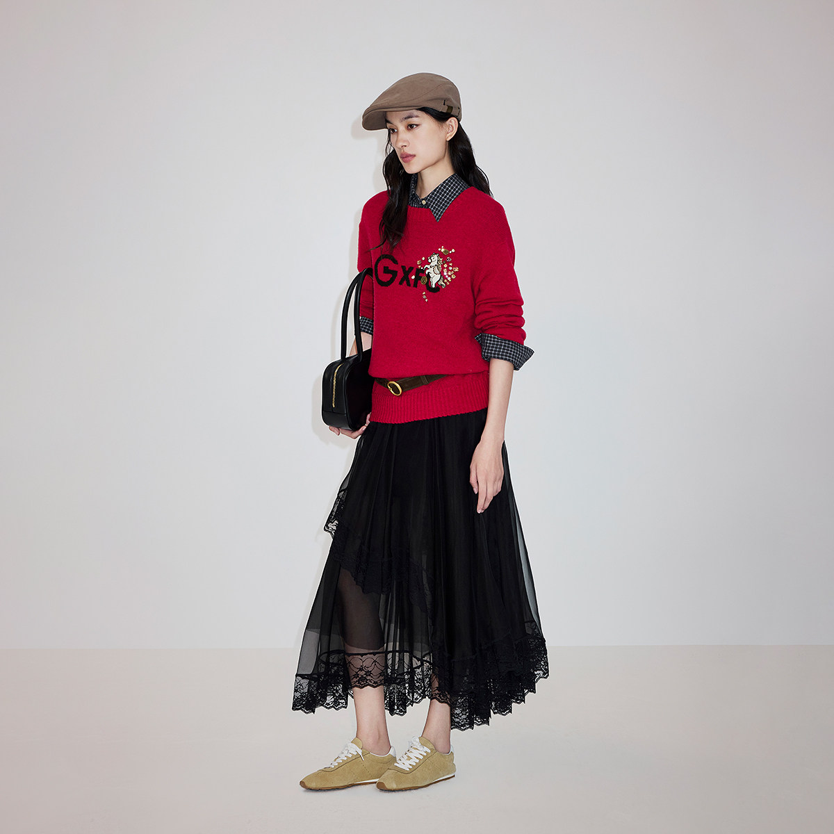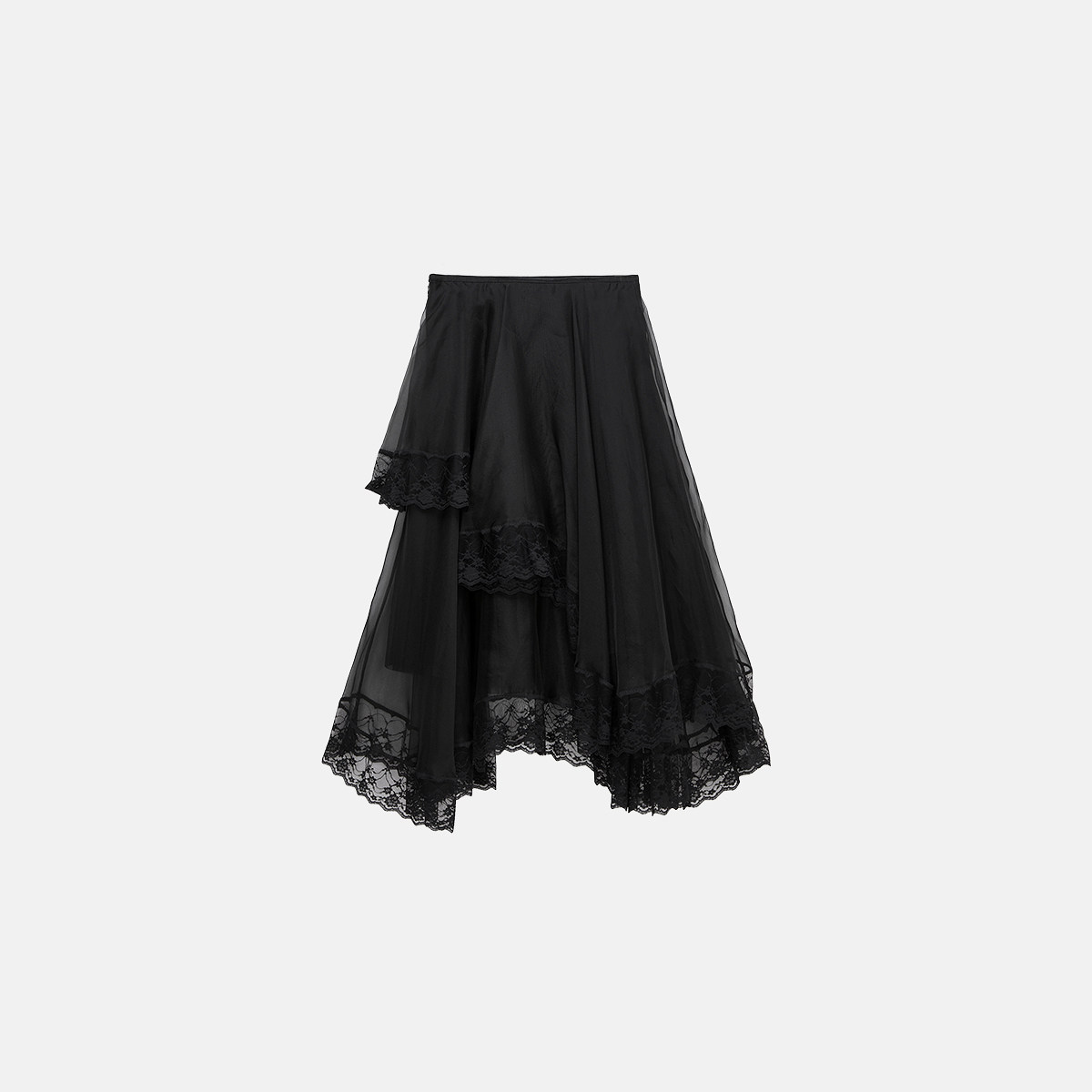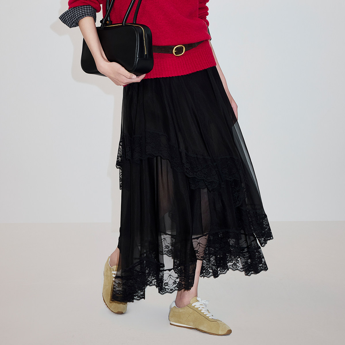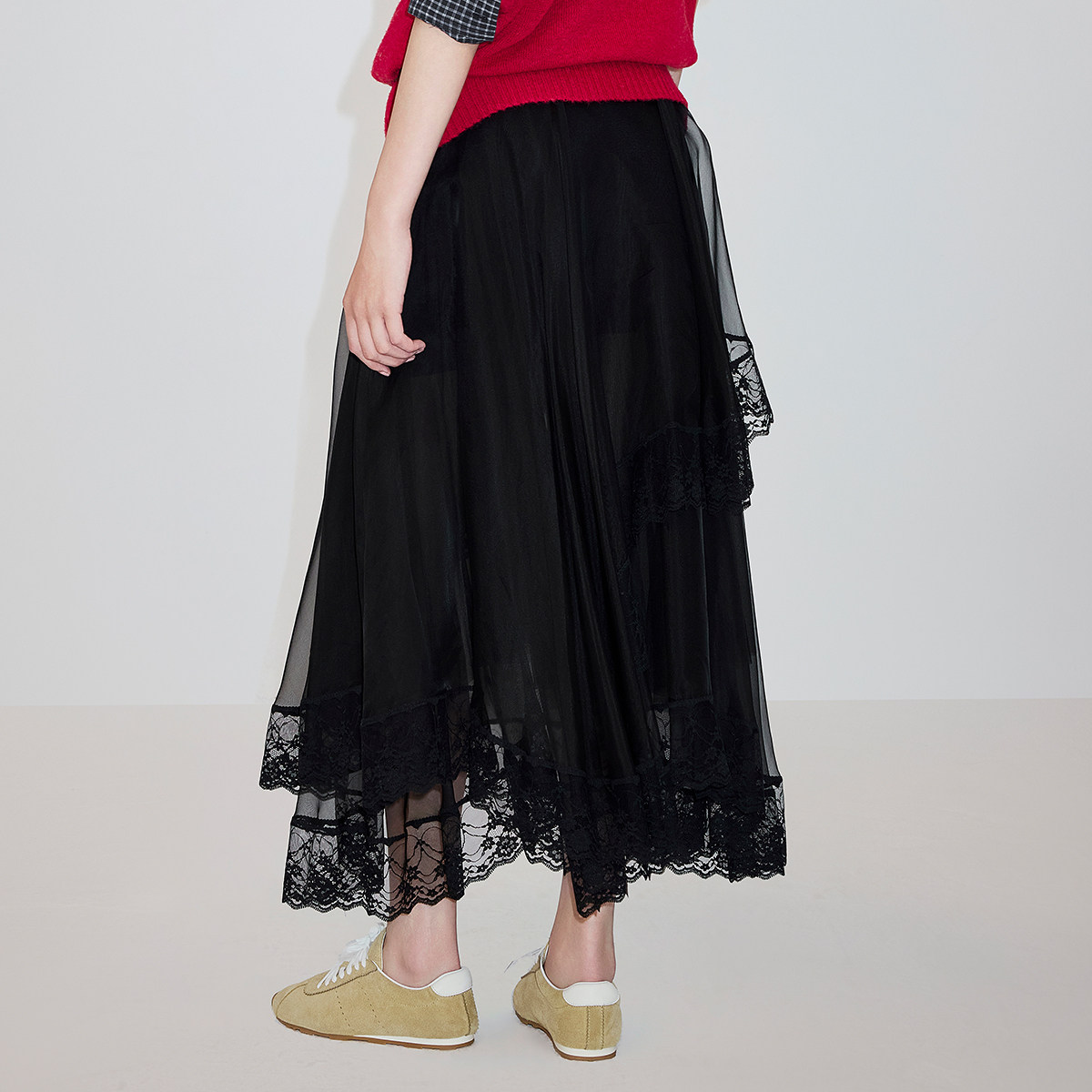 【新品】OCHIRLY欧时力 真丝纱裙不对称蕾丝花边半身裙伞裙2026春