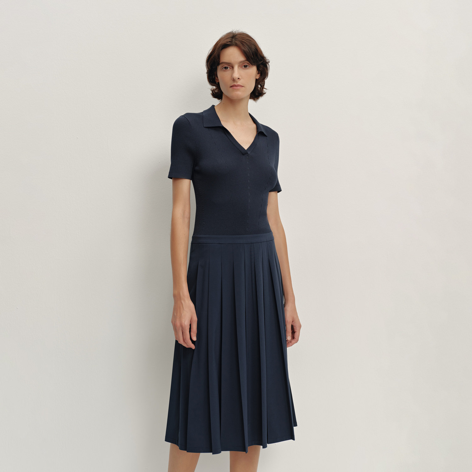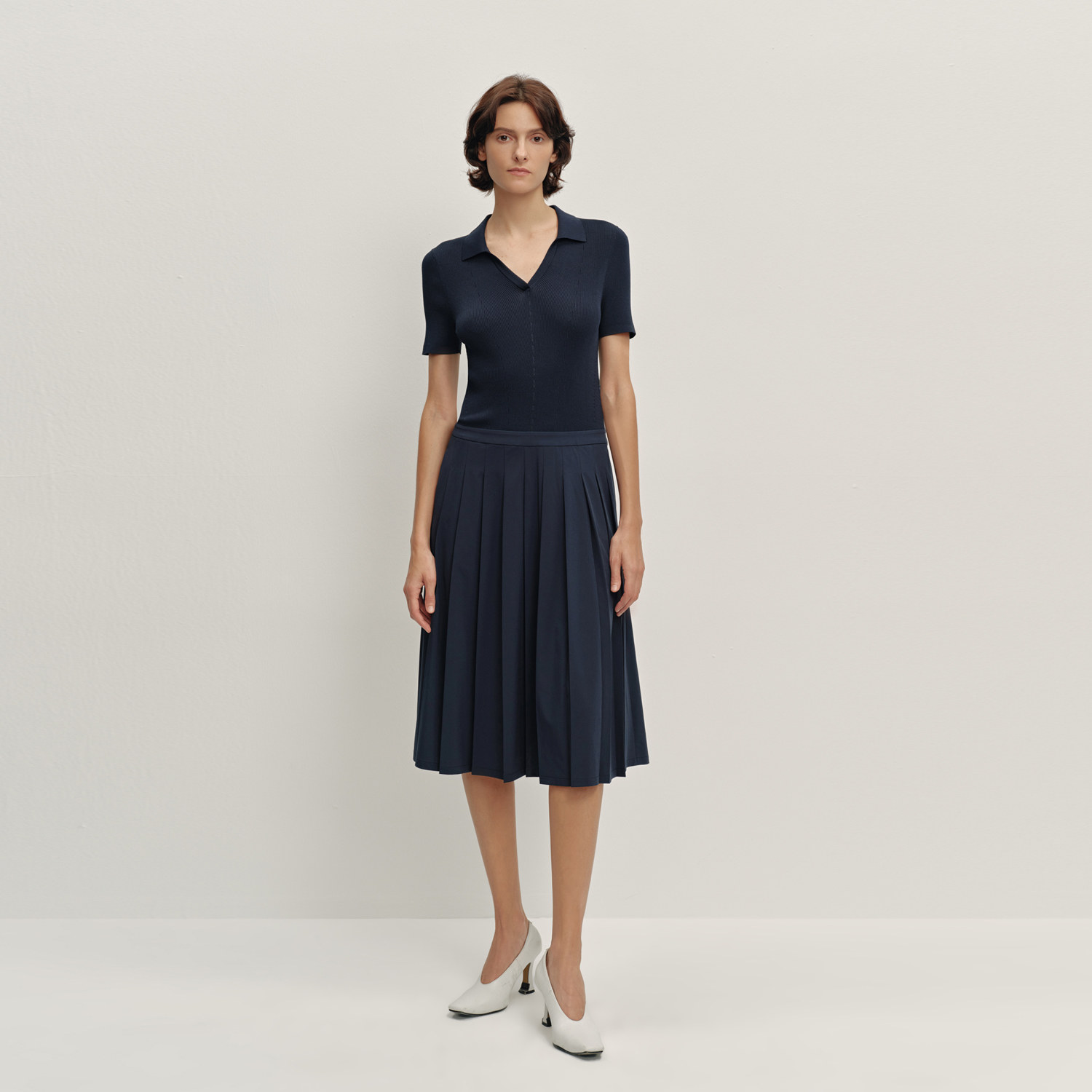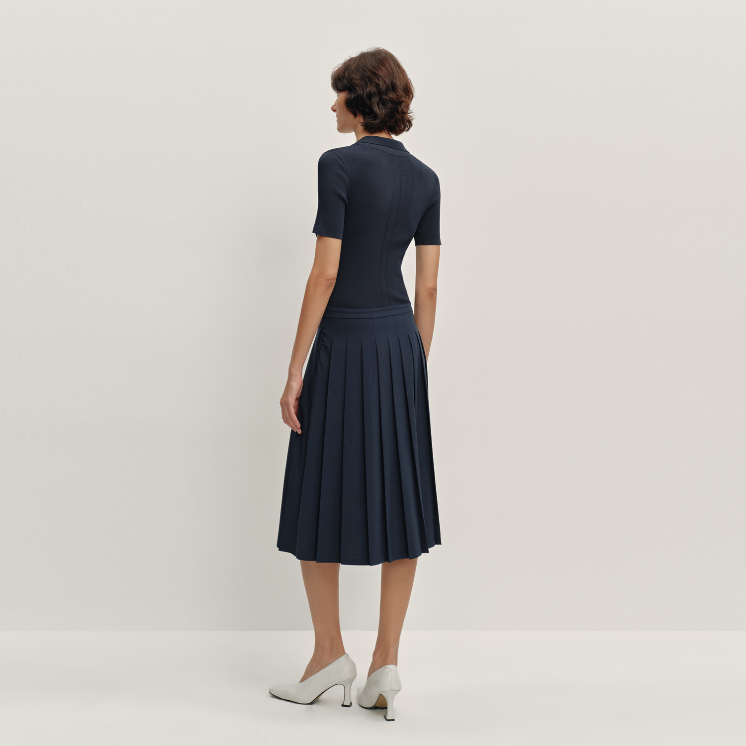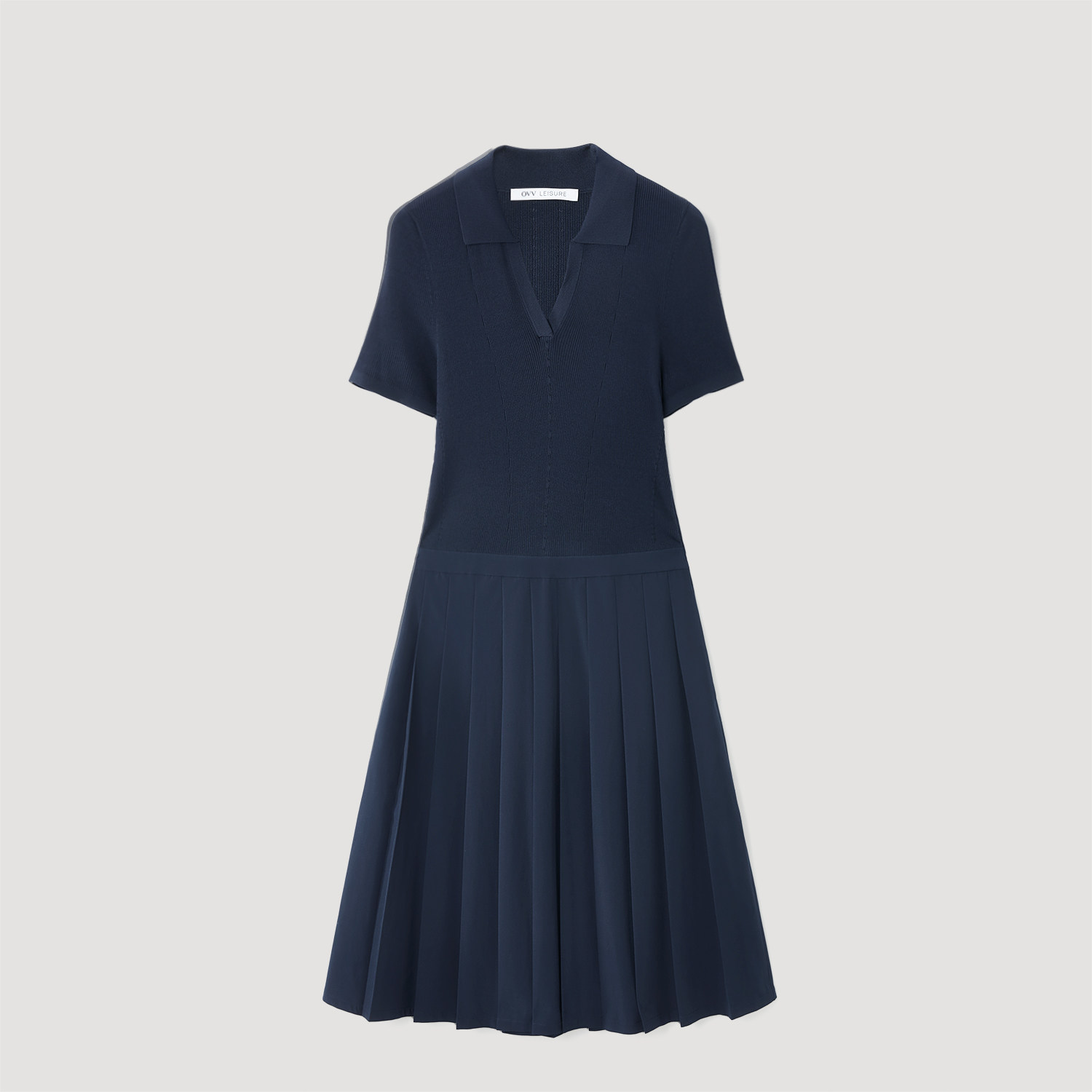 OVV2025秋冬新款女装针梭镶拼四面弹休闲通勤短袖百褶连衣裙