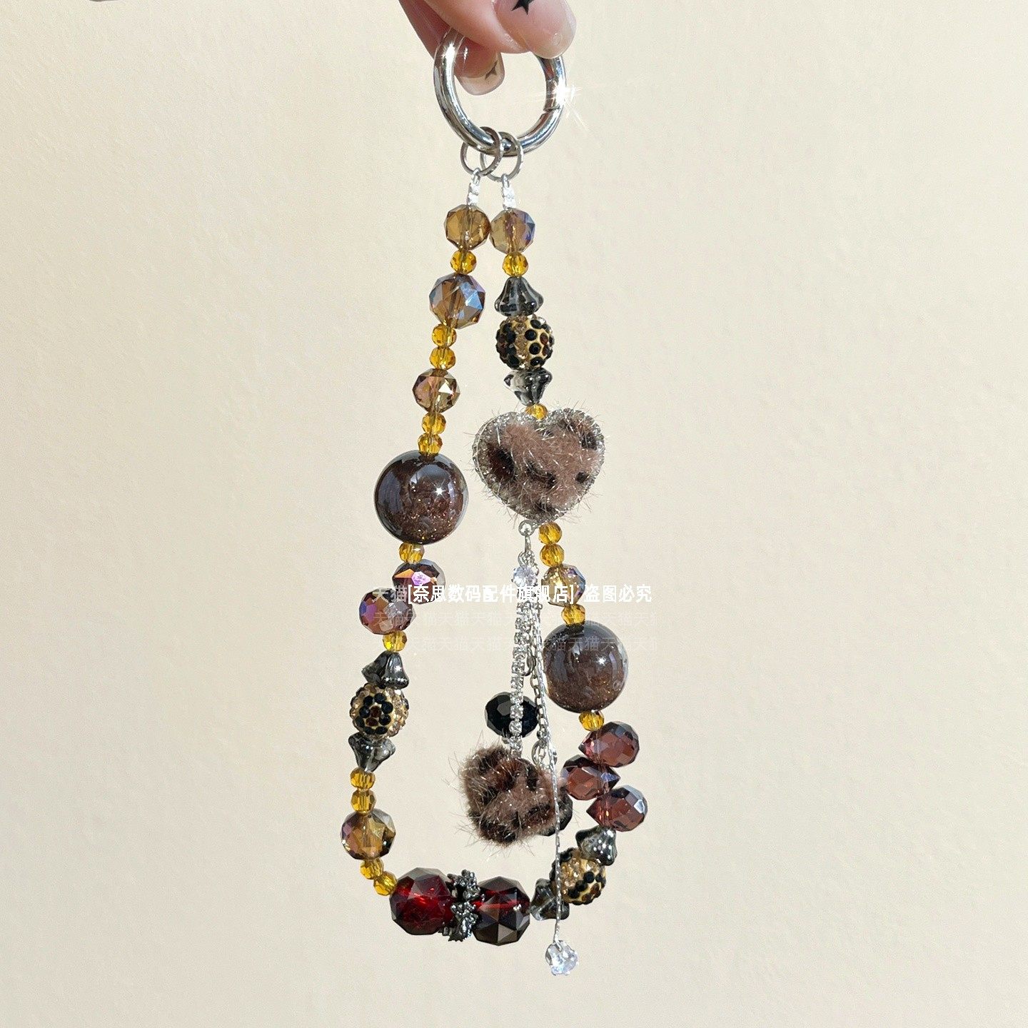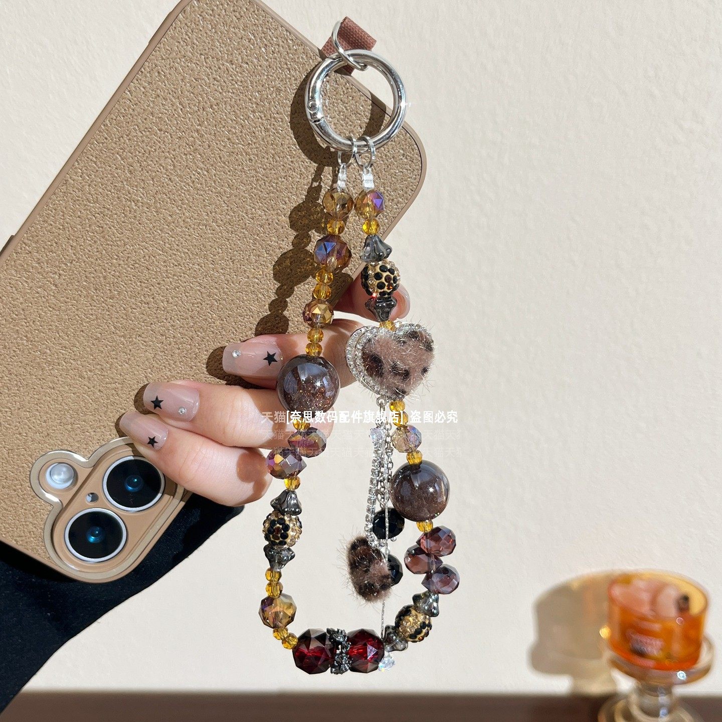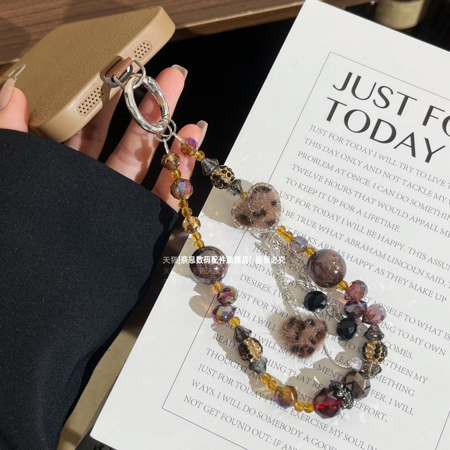 时尚设计款手机链毛绒豹纹流苏吊坠精致挂饰重工串珠手腕链条精致毛球水钻水晶漂亮手链包挂件高级腕带垫片壳