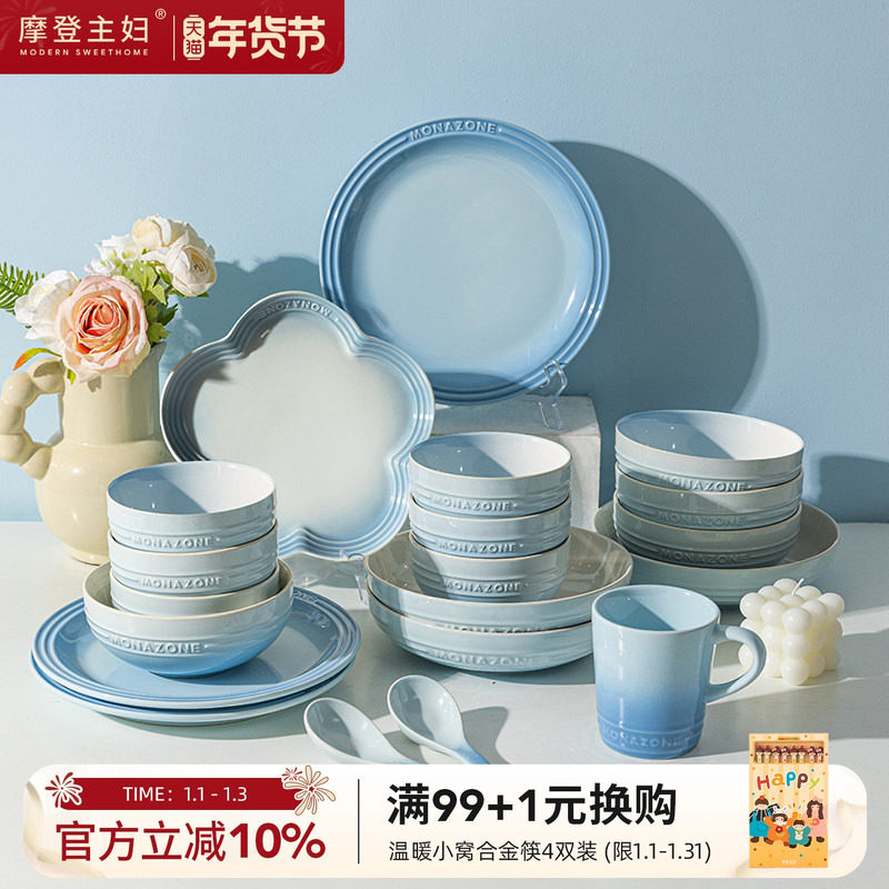 摩登主妇MONAZONE蓝色餐具碗碟套装家用碗具乔迁新居礼盒新婚礼物