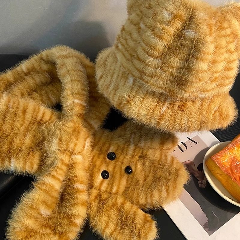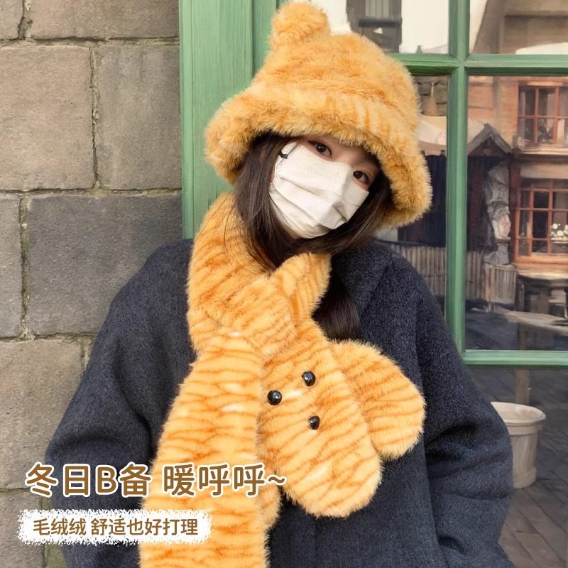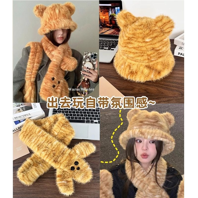 帽子女秋冬毛绒小熊渔夫帽女护脖围巾大头围可爱豹纹保暖围脖冬日