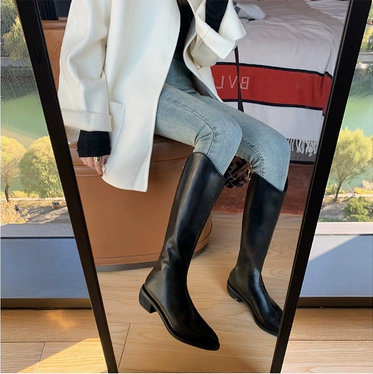 真皮~骄屿复古皮带扣粗跟长筒靴不过膝显瘦骑士靴尖头褶皱堆堆靴