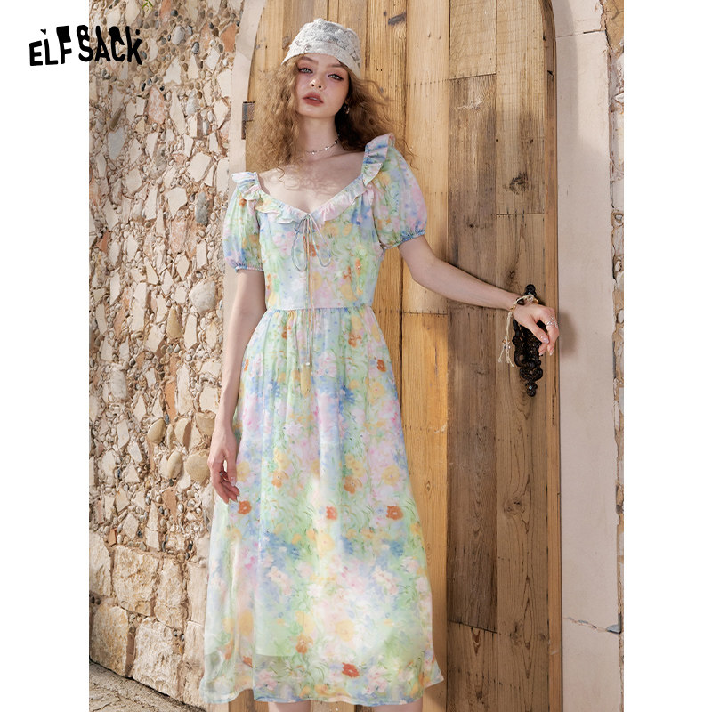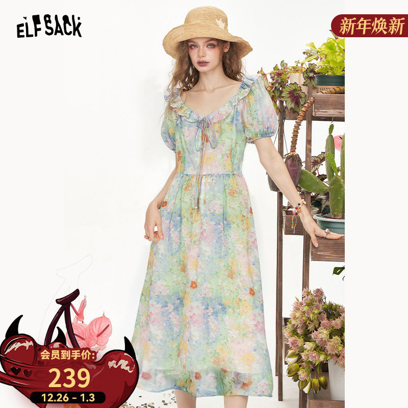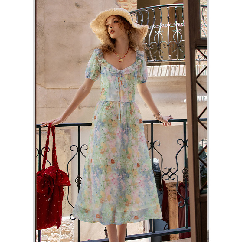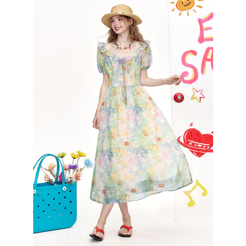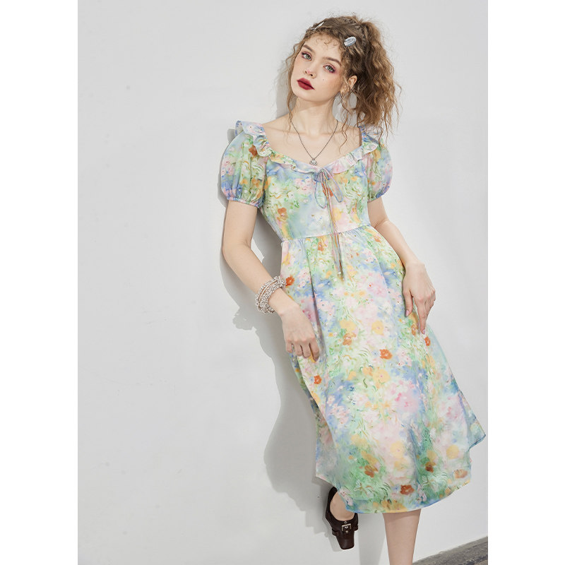 妖精的口袋油画碎花泡泡袖连衣裙女2025年夏季新款掐腰气质长裙子