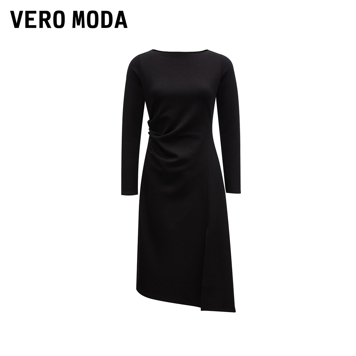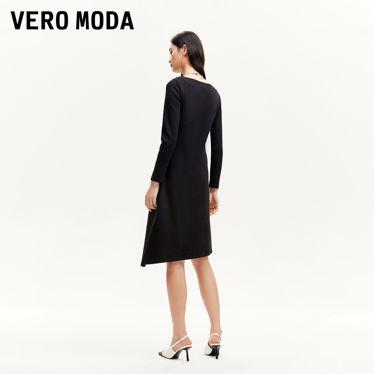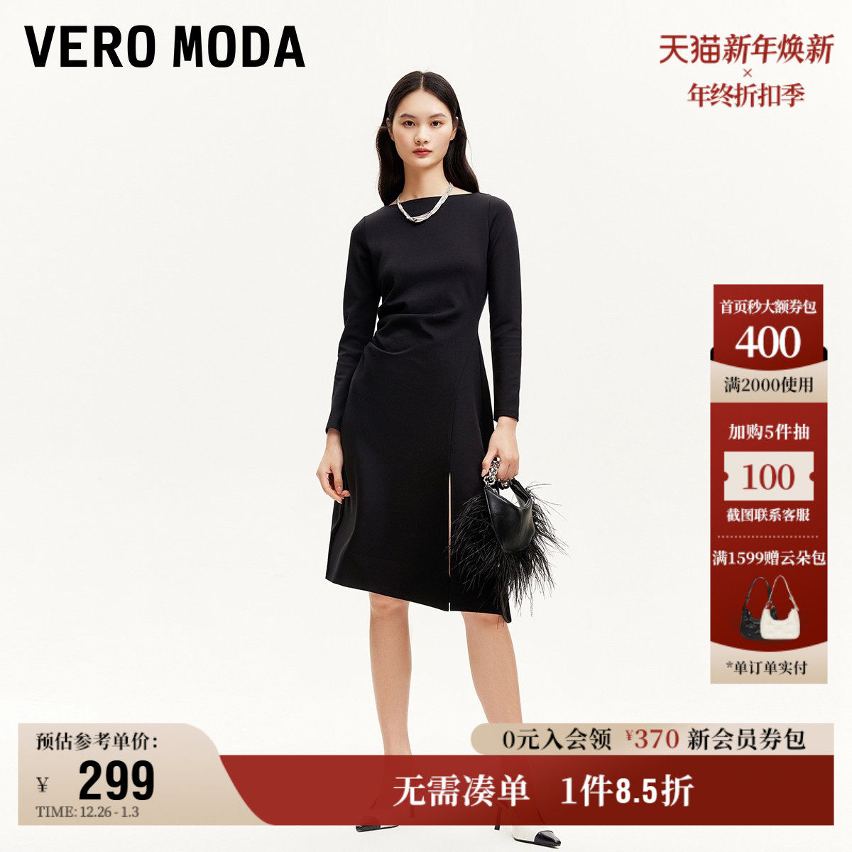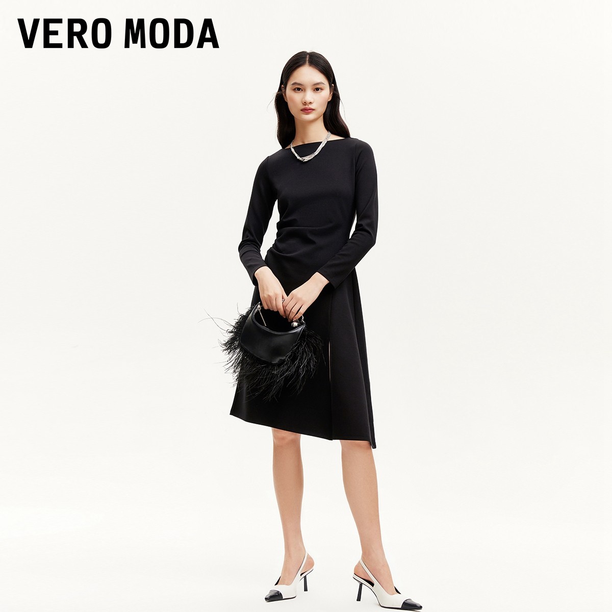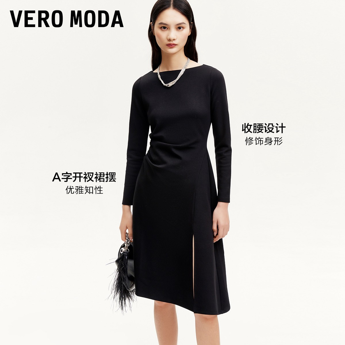 Vero Moda奥莱连衣裙秋冬新款圆领显瘦打褶开叉浪漫简约裙子流行