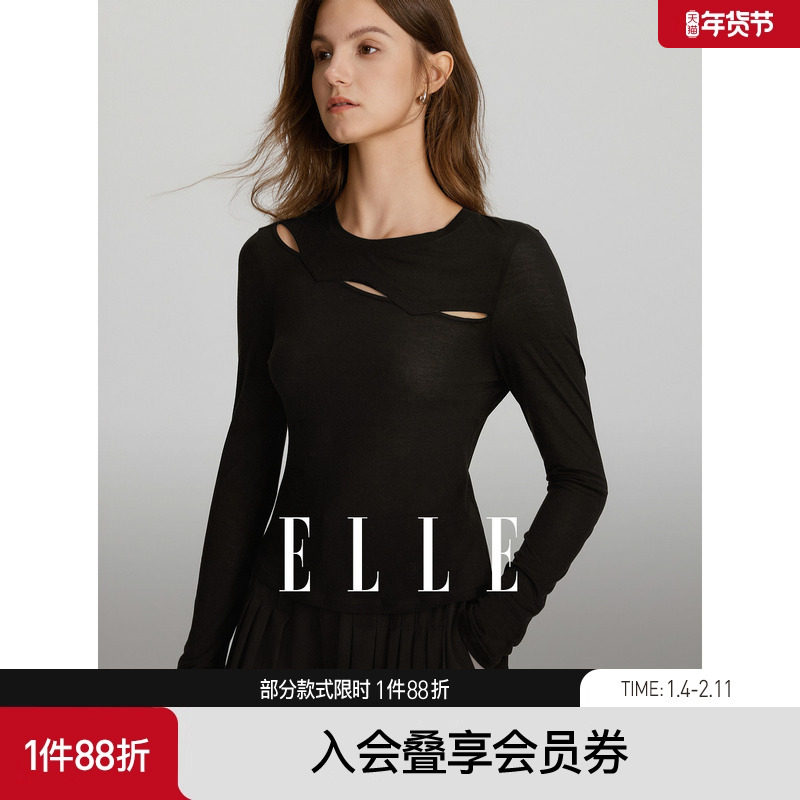 ELLE法式黑色设计感镂空圆领T恤女2025秋装新款修身气质长袖上衣