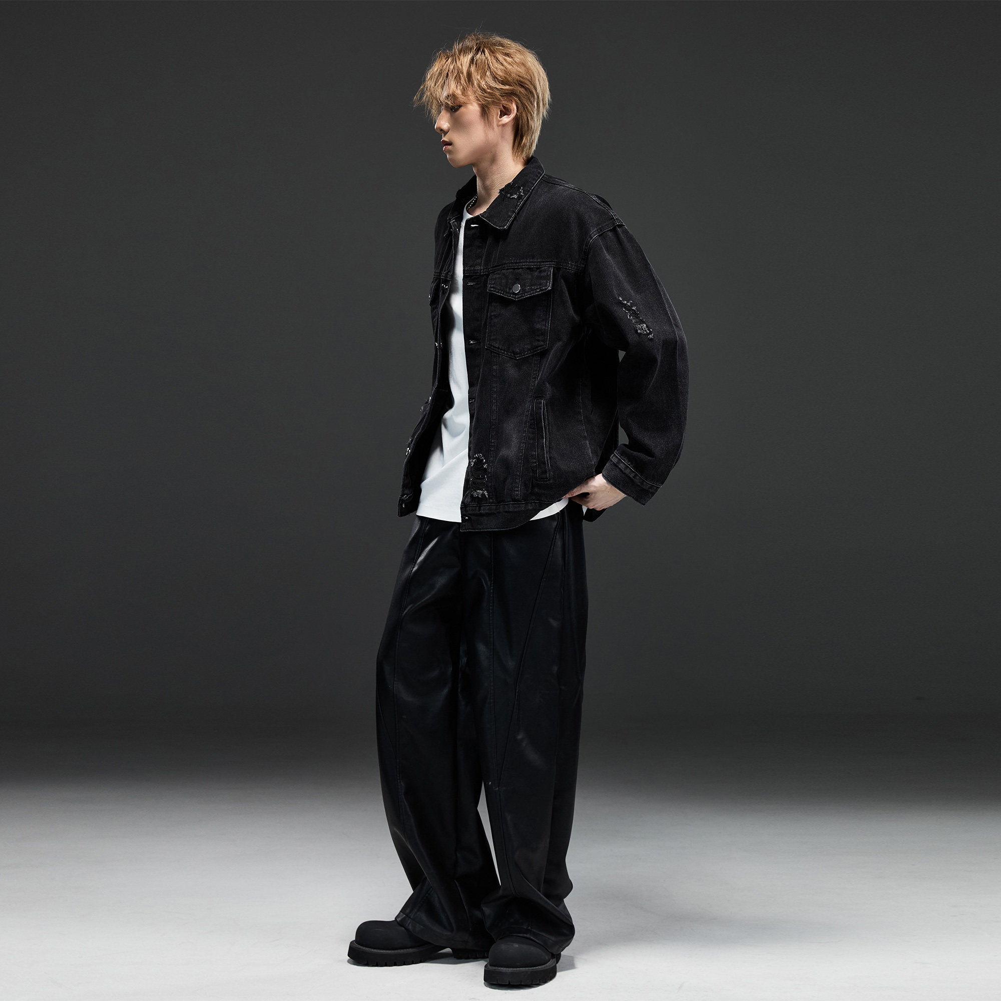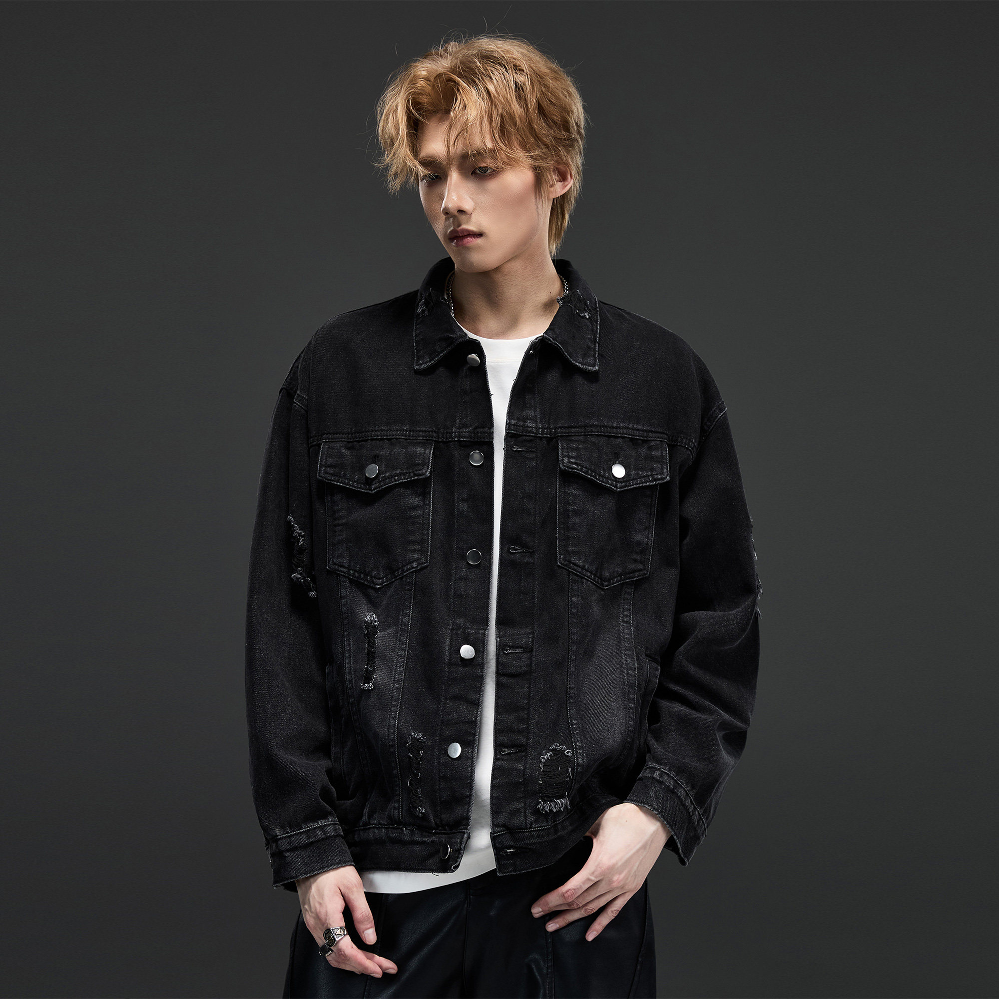 ALLIN 破洞水洗牛仔外套男秋冬季美式复古黑色牛仔衣情侣潮牌外套