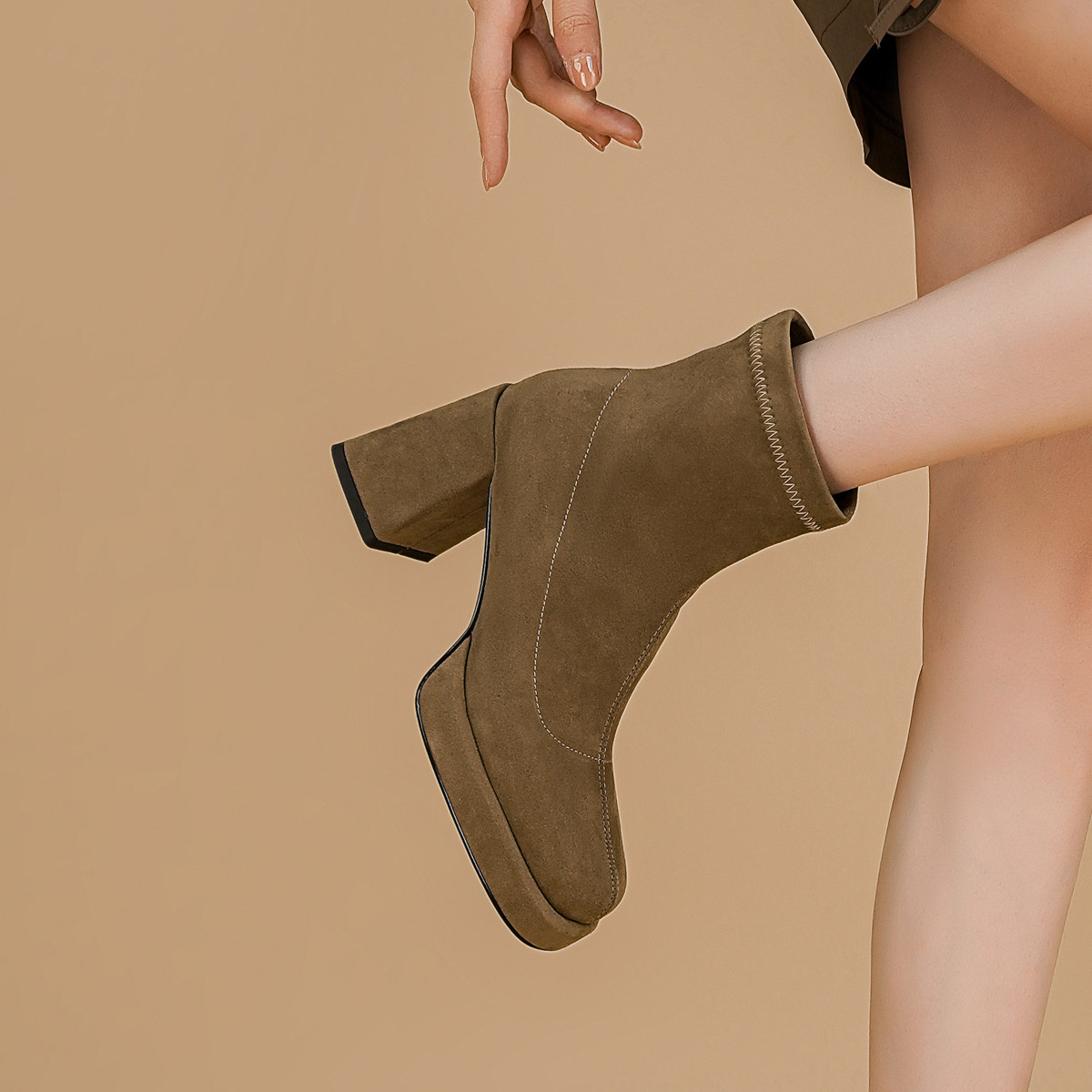 吴大叔2025秋冬季新款靴子女款美拉德尖头高跟女靴弹力短靴瘦瘦靴