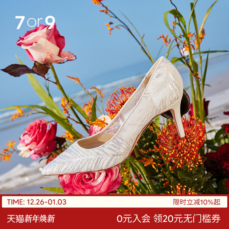 7or9白羽法式婚鞋不累脚2025新款白色空气棉高跟鞋西式订婚鞋女