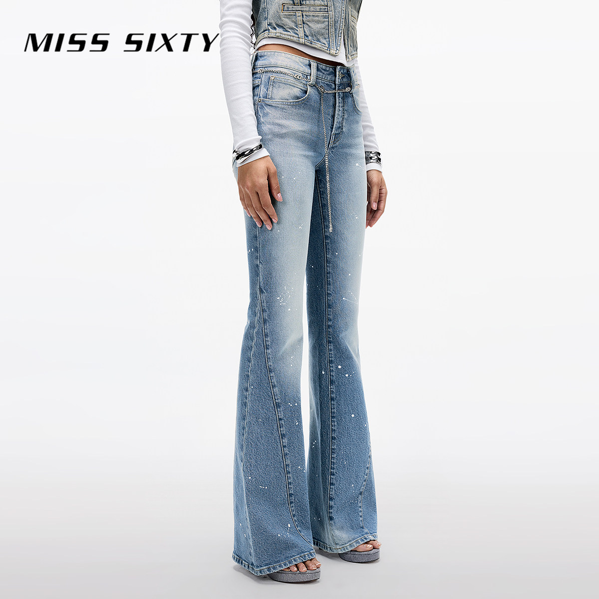 【进口牛仔面料】Miss Sixty2025春秋新款配腰链泼点微喇叭牛仔裤