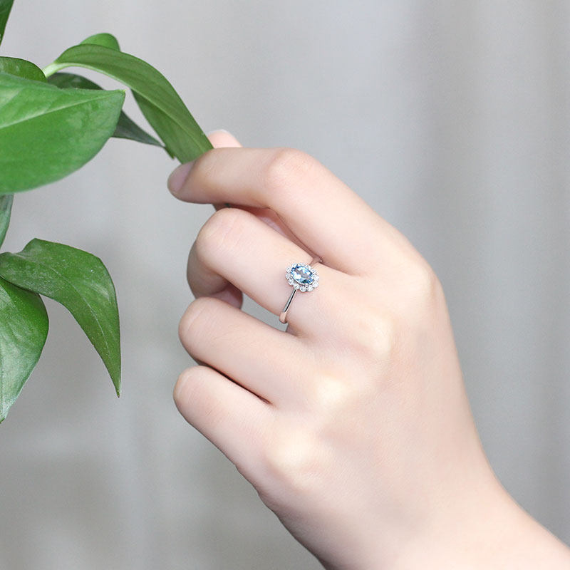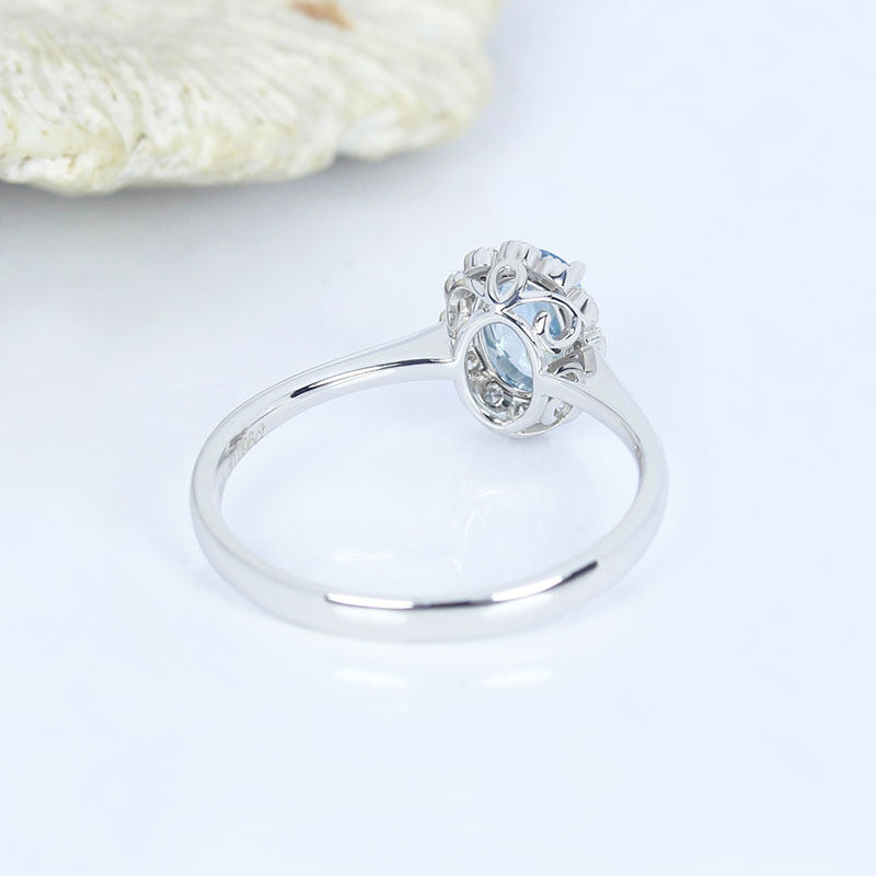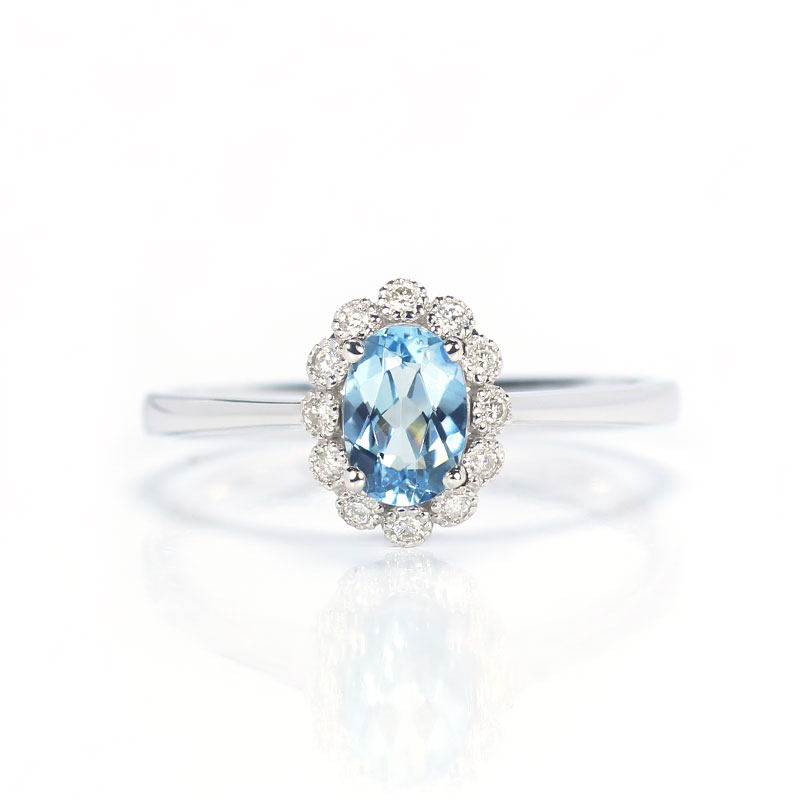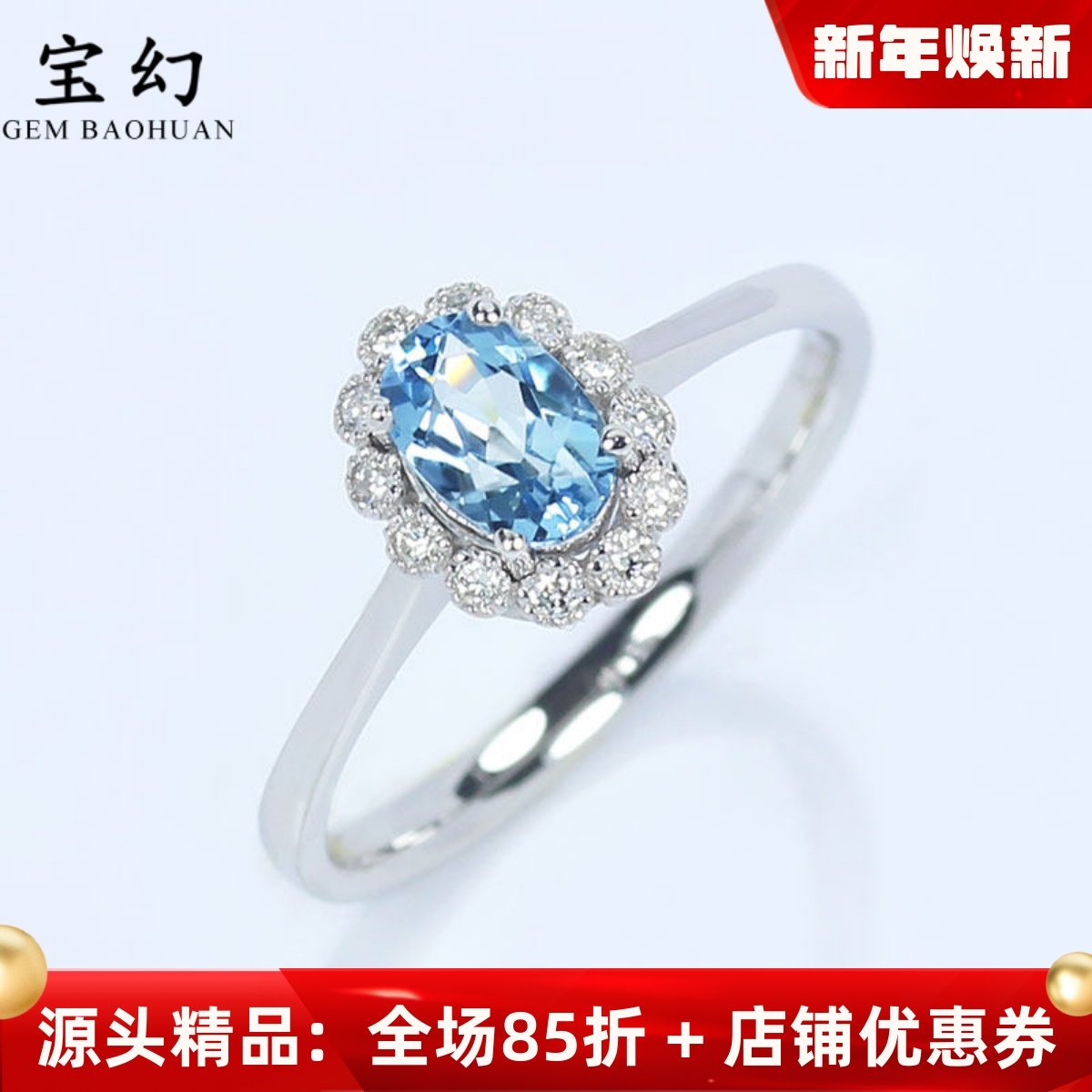 18K白金天然海蓝宝石清新复古戒指 天蓝色宝石镶钻石手饰女款正品