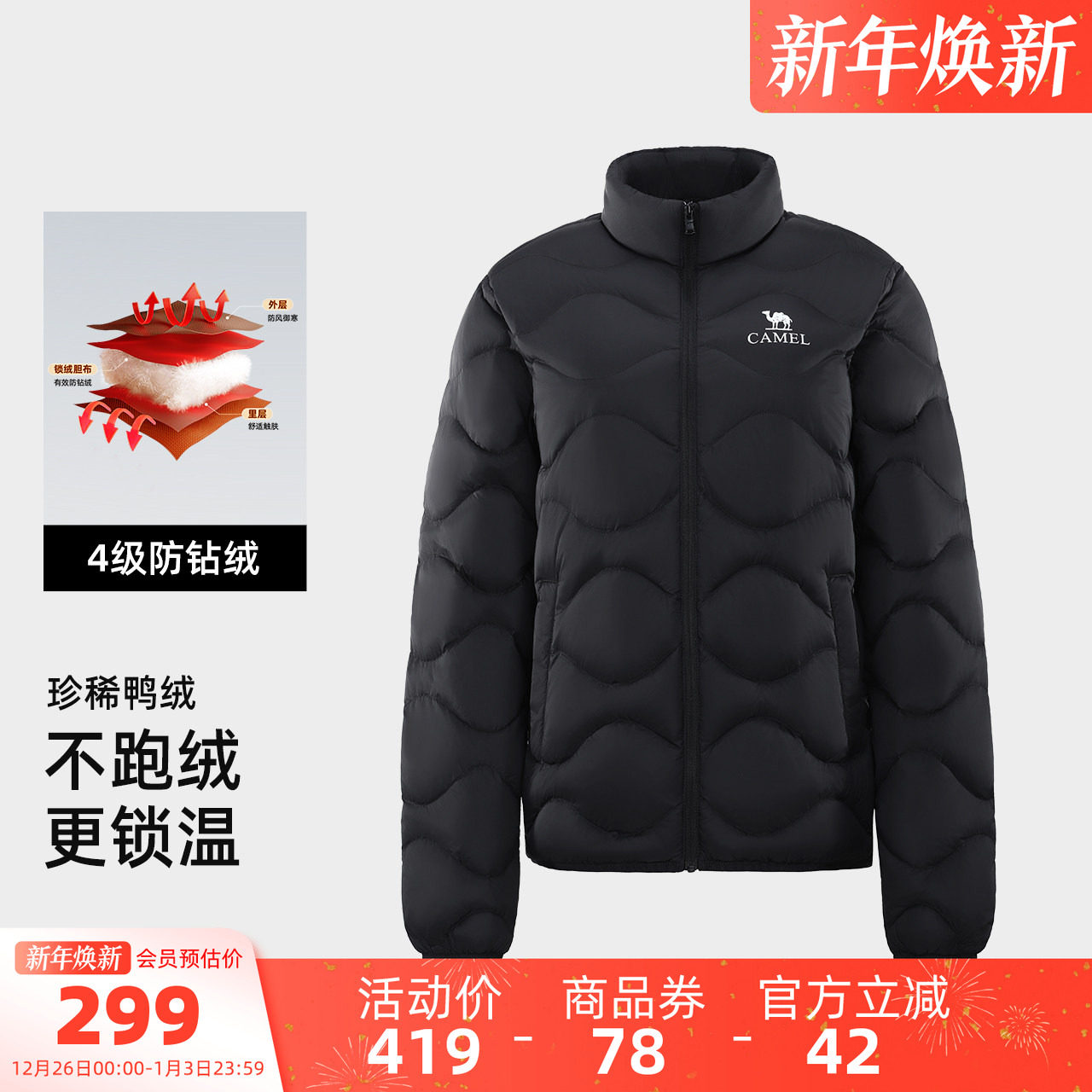 骆驼女装轻薄立领羽绒服2025年冬季新款90绒鸭绒菱格羽绒外套茄克