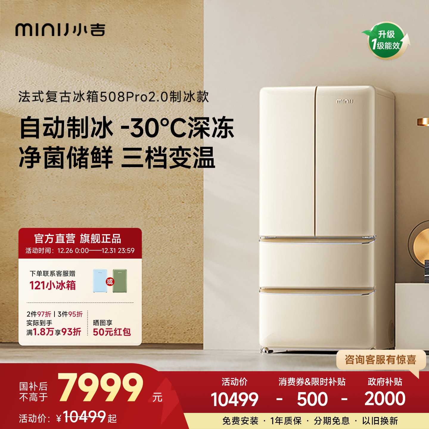 小吉508Pro2.0大容量复古法式四门家用冰箱风冷自动制冰机冰箱
